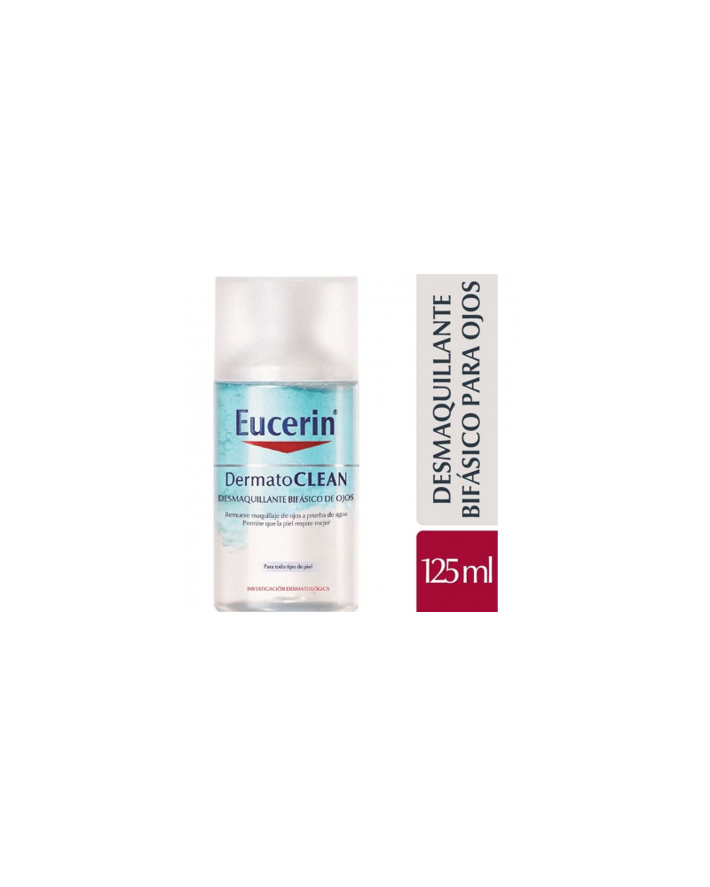 Eucerin Dermatoclean es un desmaquillante de dos fases permite eliminar incluso el rímel más resistente mientras cuida la sensible zona de los ojos. Adecuado para personas que usan lentes de contacto, elimina suavemente el maquillaje de ojos, incluso el rímel resistente al agua. Ayuda a que la piel sensible alrededor de los ojos respire mejor. Se ha probado en la piel sensible y en los ojos demostrando su compatibilidad. Una fórmula no grasa, de dos fases con: una capa superior para eliminar el maquillaje resistente al agua y una capa inferior para eliminar el maquillaje soluble en agua con complejo APG, glucoglicerol, ácido hialurónico.