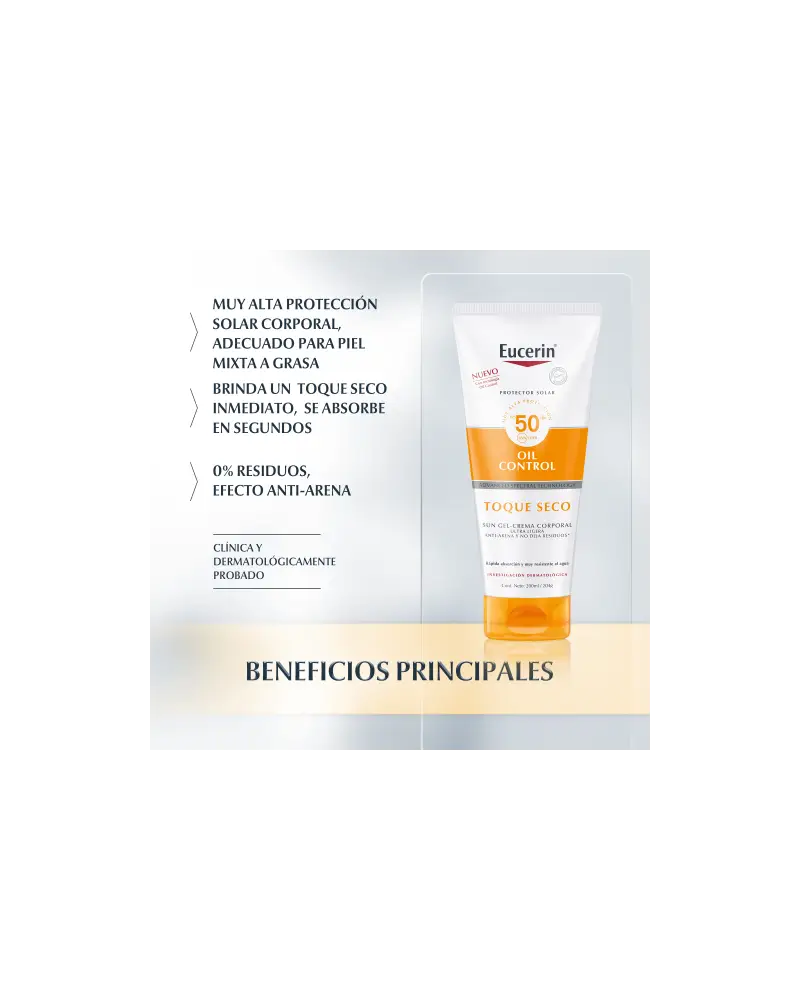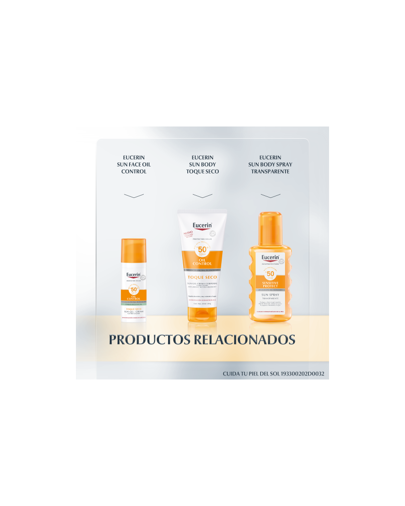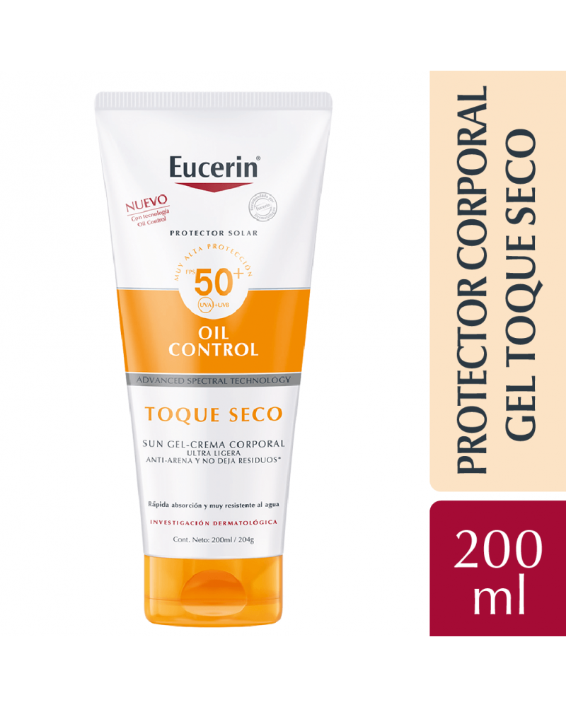 El Protector solar en crema Eucerin Oil Control Sun Gel Toque Seco proporciona protección de nivel superior contra los daños de la piel incluidos por el sol y ayuda a prevenir el fotoenvejecimiento. Esta crema para el rostro es muy resistente al agua, al sudor y es "anti-arena", lo que quiere decir que es menos probable que la arena se pegue a la piel. Su fórmula con Advanced Spectral Technology combina Licochalcona A, Ácido Glicirretínico y Carnitina, ingredientes que cuidan a la piel y le dan un acabado mate seco, inmediato y duradero por ocho horas. También contiene FPS 50 y un sistema de filtros UVA/UVB fotoestable y altamente eficaz para brindar una protección confiable. El protector solar se absorbe rápidamente y no deja residuos en la piel. Está probado en todo tipo de pieles, incluso piel sensible, grasa y con tendencia al acné.