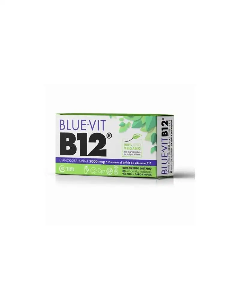 - INFORMACIÓN DEL PRODUCTO Blue-Vit B12 es un suplemento dietario a base de Cianocobalamina (vitamina B12). La vitamina B12 es un nutriente esencial. Considerando que esta vitamina se obtiene exclusivamente de productos de origen animal, se encuentra especialmente indicado para vegetarianos y veganos, personas mayores de 60 años, personas cuya ingesta no alcanza los requerimientos diarios de vitamina B12 y personas con condiciones médicas específicas, como por ejemplo: · Anemia perniciosa. · Quienes toman ciertos medicamentos (metformina, inhibidores de la bomba de protones, entre otros) en forma prolongada. · Infecciones por Helicobacter Pylori que produce gastritis atrófica. · Resecciones gástricas por obesidad o cáncer, enfermedad inflamatoria del intestino y enfermedad celíaca. - DESCRIPCIÓN Blue-Vit B12 es un suplemento dietario que aporta 2.000mcg de Cianocobalamina (vitamina B12) por comprimido masticable, sabor ananá, 100% apto vegano. Esta es la dosis recomendada tanto para lograr una reposición de las reservas (déficit diagnosticado), como para el mantenimiento y prevención del déficit de vitamina B12. Ver posología. - POSOLOGÍA Blue-Vit B12 se puede tomar en cualquier momento del día, lejos de otra vitamina y/o medicamento. Dosis inicial (reposición de reserva): 1 comprimido diario durante 30 días. Dosis de mantenimiento: 1 comprimido por semana. - COMPOSICIÓN Cianocobalamina (vitamina B12) 2000mcg - PRESENTACIÓN Envase por 20 comprimidos masticables, sabor ananá.