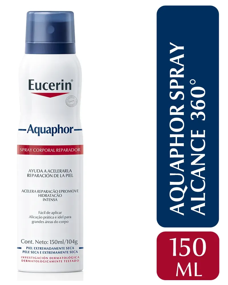 Cuando se altera la barrera protectora de la piel, ésta se vuelve más susceptible a factores irritantes externos. A menudo, la piel irritada puede requerir algo más que una loción para sentirse realmente calmada. En estos casos, se recomienda un ungüento para reparar la piel seca o irritada, pero éstos pueden ser difíciles de aplicar en áreas más extensas del cuerpo como los brazos, piernas y torso debido a su textura. Para un alivio inmediato y de fácil aplicación en áreas más extensas del cuerpo, creamos Eucerin Aquaphor Spray Reparador. Este formato permite una aplicación fácil en zonas extensas del cuerpo. Además, se puede usar al revés, lo que permite un acceso de 360° en cualquier parte del cuerpo. Está clínicamente comprobado que Eucerin Aquaphor Spray Reparador repara la piel seca y agrietada al crear una barrera protectora ideal para la reparación de la piel, brindando una sensación de alivio inmediato. La fórmula está enriquecida con Glicerina y Pantenol para ayudar a mantener los niveles de hidratación de la piel y a estimular su reparación. Estudios Clínicos y Dermatológicos. Estudios demuestran una muy buena eficacia y tolerabilidad en pieles secas, extremadamente secas, ásperas o irritadas. Sin perfumes. Sin conservantes. Sin agua. No comedogénico. No graso. Se absorbe rápidamente. Fórmula en spray fácil de aplicar Adecuado para pieles sensibles. Modo de uso: Paso 1 – Agite bien antes de usar Paso 2 – Aplicar a 15 centímetros de la piel Paso 3 – Frote suavemente la piel según sea necesario. Aplicar tantas veces como sea necesario. No aplicar sobre heridas abiertas, sangrantes o húmedas. Evite la pulverización prolongada y la inhalación directa.