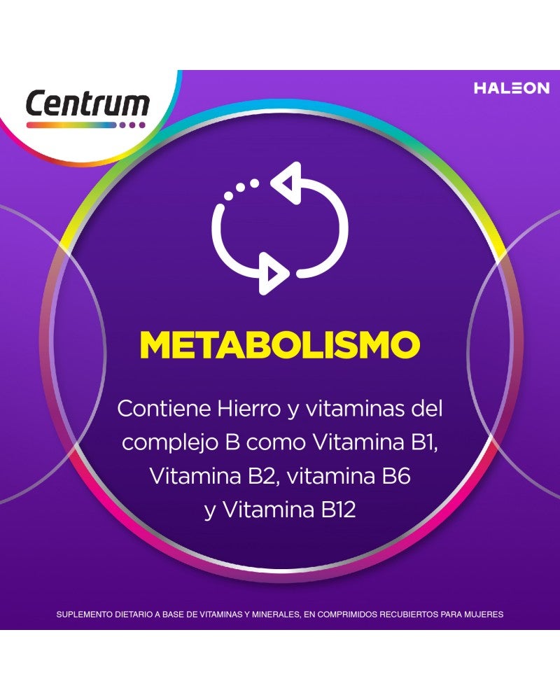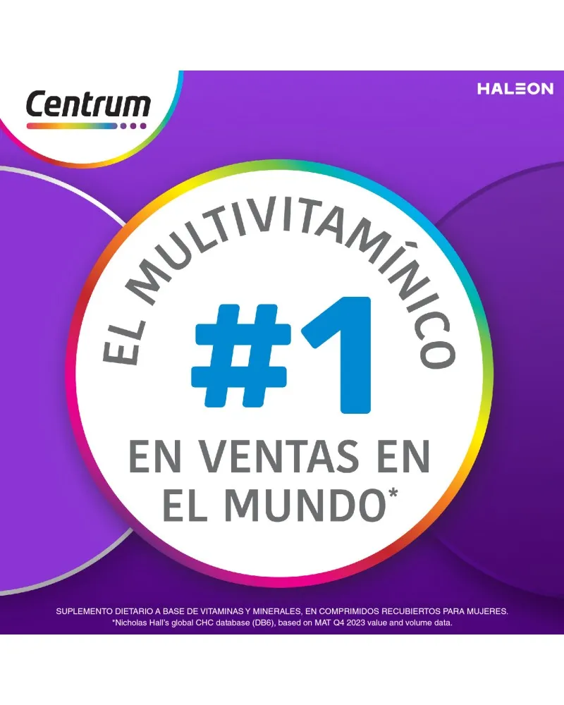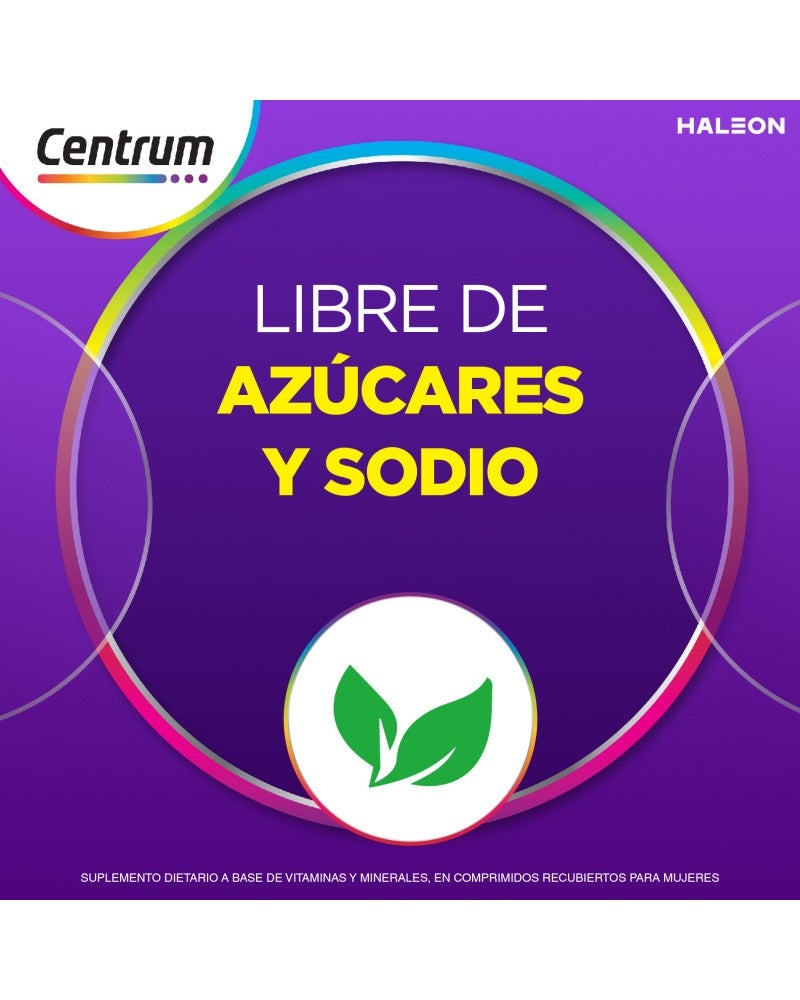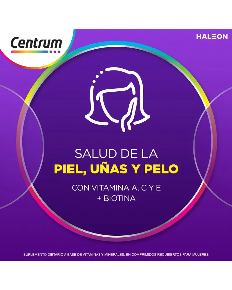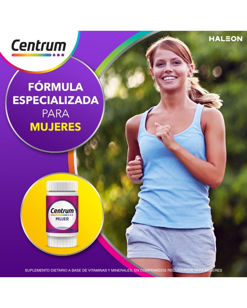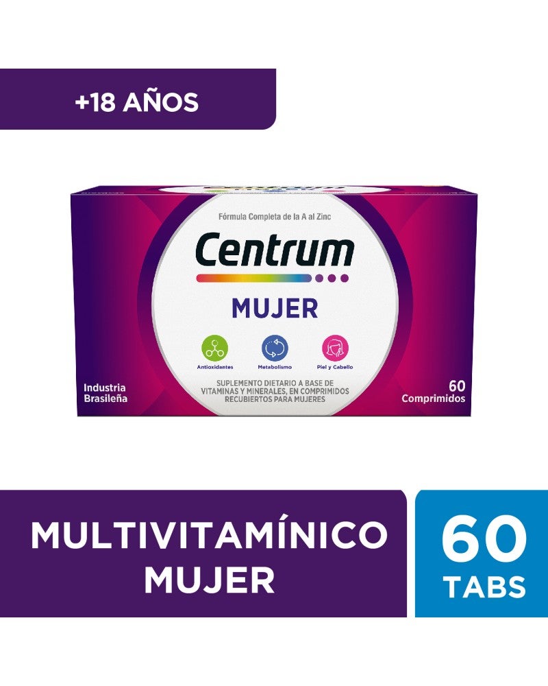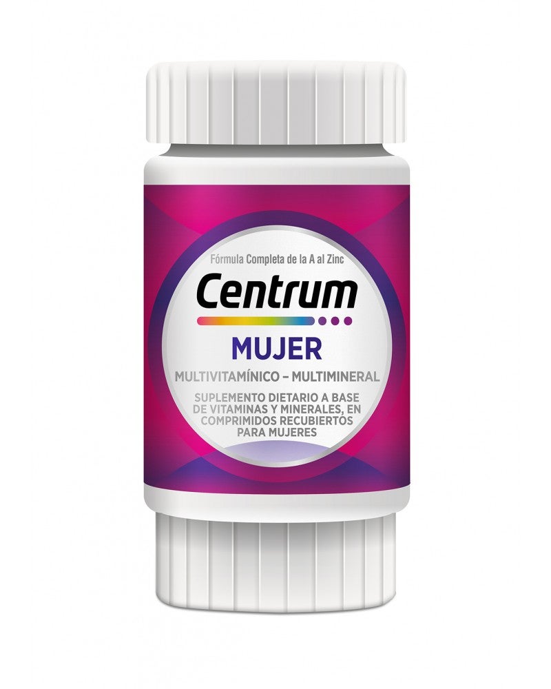 Un multivitamínico completo formulado desde la Vitamina A al Zinc. Su fórmula equilibrada está especialmente desarrollada para satisfacer las necesidades nutricionales específicas de las mujeres. Centrum Mujer es libre de grasas totales, calorías, azúcares y sodio. La fórmula de Centrum Mujer contiene micronutrientes que ayudan a: Energía, inmunidad, balance nutricional, salud de la piel, uñas y cabello, fortalecimiento de los huesos y metabolismo. Tomá Centrum Mujer todos los días y descubrí sus beneficios. Especialmente formulado para Mujeres Ayuda a fortalecer tus defensas Ayuda a fortalecer tus huesos Ayuda a la salud de la piel, cabello y uñas Fórmula completa de la A a la Z MODO DE USO Se recomienda tomar 1 comprimido al día, preferentemente por la mañana. PRESENTACIONES Envases de 30 y 60 comprimidos
