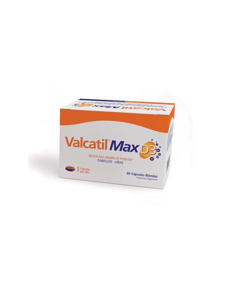 El pelo y las uñas son estructuras anexas a la piel, que se nutren de aminoácidos, vitaminas y minerales, para mantenerse sanos y fuertes, pero a veces se pueden ver afectados por la agresión de diversos factores tanto externos como internos. Por este motivo, es de vital importancia restablecer y mantener la normal estructura de la queratina. El aporte de Aminoácidos, Vitaminas y Minerales es esencial para su formación, mejorando así la cantidad y calidad del cabello e incrementando el crecimiento y dureza de las uñas. VALCATIL MAX D3 aporta los elementos necesarios para ayudar a fortalecer la salud de cabellos y uñas. INGREDIENTES Suplemento dietario a base de L-Metionina, L-Cistina, Pantotenato de Calcio, Zinc, Biotina, Vitamina B6 y Vitamina D3 en cápsulas blandas.