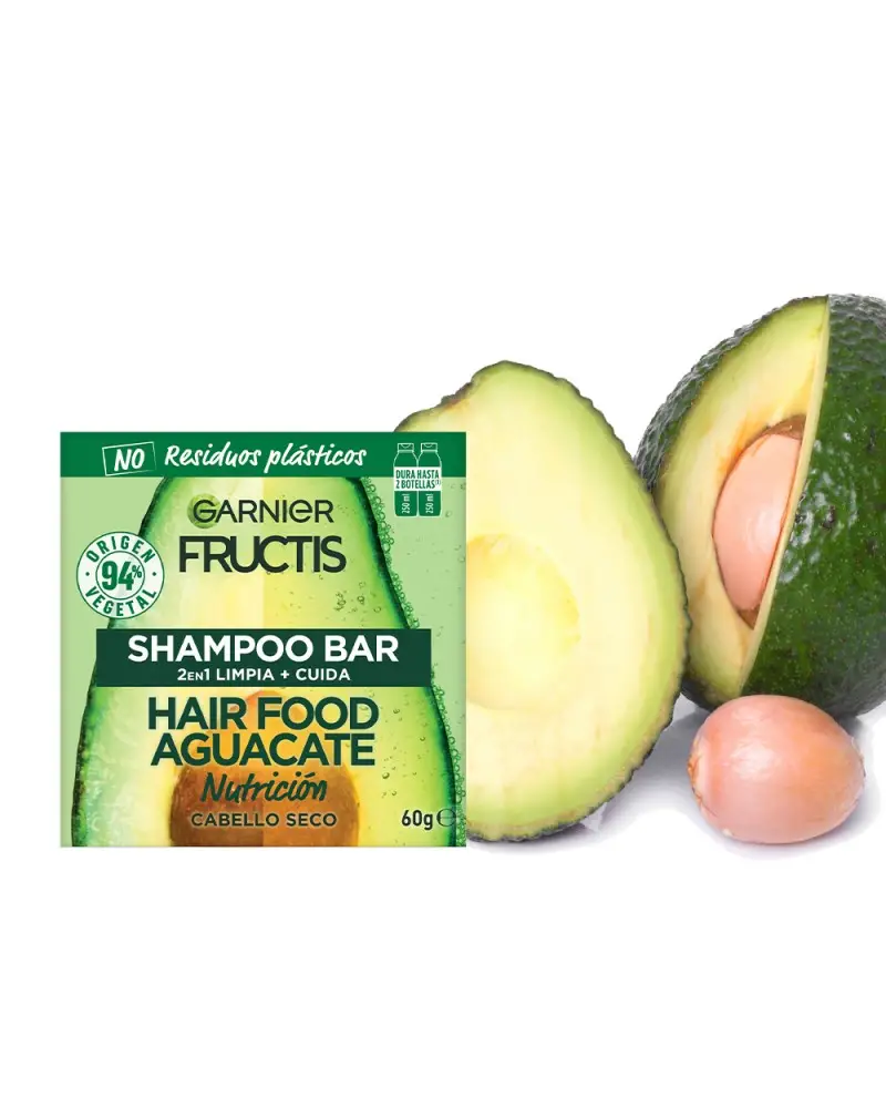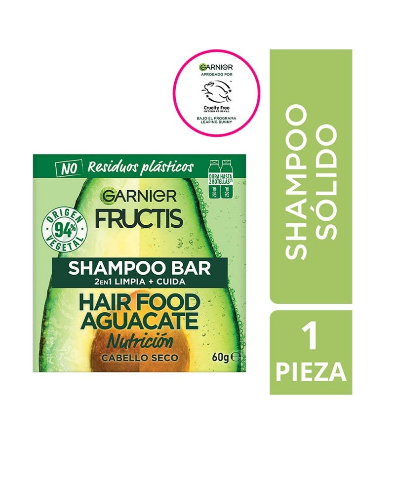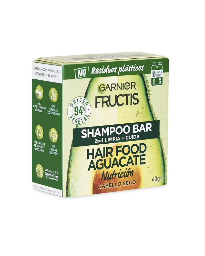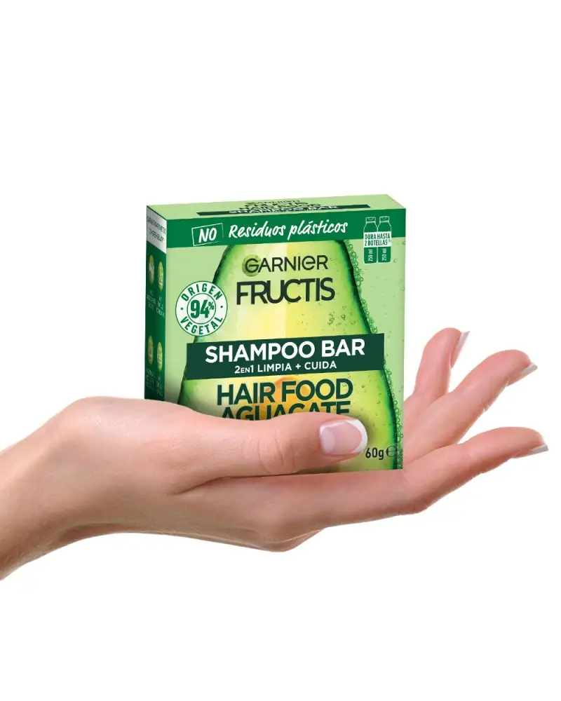 SUMATE VOS TAMBIEN A LA REVOLUCIÓN VERDE DEL SHAMPOO SOLIDO PARA UN SÚPER PELO con Fructis Hair Food Shampoo Sólido Palta. 1. LIMPIA & 2. NUTRE tu pelo, sin dejarlo pesado.'¿QUÉ ES? Un shampoo sólido en barra, cargado de súper frutas y nutrientes para limpiar Y nutrir tu pelo seco. Hecho con ingredientes de 94% origen vegetal y con 0% plástico, ¡este shampoo super sustentable es la nueva forma de cuidar tu pelo y el planeta!BUENO PARA VOS Y PARA EL PLANETA:SI VEGANO (1)SÍ 96% BIODEGRABALE (2)SÍ 94% ORIGEN VEGETAL (3)SÍ TESTEADO DERMATOLÓGICAMENTESÍ CRUELTY FREESÍ FÁCIL ENJUAGUESÍ RECICLABLESÍ CARTÓN CERTIFICADO POR FSCNO SILICONASNO RESIDUOS PLÁSTICOSNO CONSERVANTESNO COLORANTES ARTIFICALESNO SILICONAS¿CÓMO USARLO? Mojá tu pelo y frotá el shampoo sólido en tus manos bajo el agua; se convertirá rápidamente en una rica espuma. Después, frotá la barra de raíz a puntas para generar más espuma. Masajeá tu pelo y enjuagá como de costumbre.IMPORTANTE! Guarda tu shampoo sólido en un lugar seco y fresco para conservarlo mejor. Es importante dejarla secar muy bien entre usos y además de elegir jaboneras que drenen bien el agua.1 barra de shampoo sólido equivale a 2 botellas de shampoo líquido de 250ml. (4)(1) Sin ingredientes de origen animal o componentes derivados. (2) Según OECD 301 o test equivalentes. (3) El 6% restante (indicado con**) aseguran la sensorialidad y la buena conservación de la fórmula. (4) La cantidad puede variar dependiendo de la longitud del cabello.