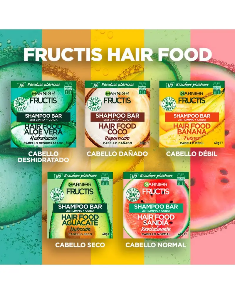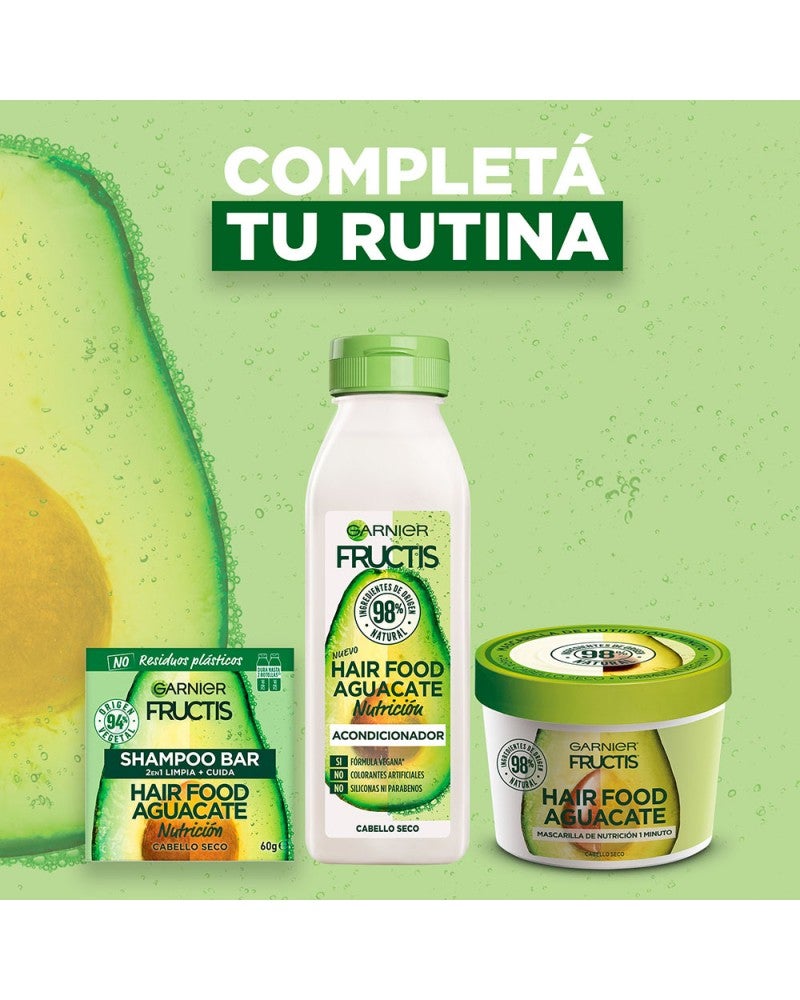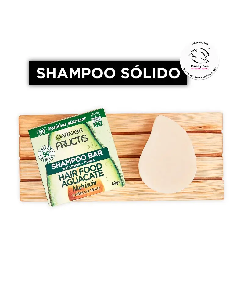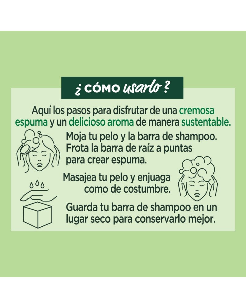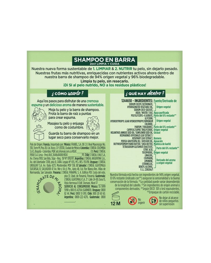 SUMATE VOS TAMBIEN A LA REVOLUCIÓN VERDE DEL SHAMPOO SOLIDO PARA UN SÚPER PELO con Fructis Hair Food Shampoo Sólido Palta. 1. LIMPIA & 2. NUTRE tu pelo, sin dejarlo pesado.'¿QUÉ ES? Un shampoo sólido en barra, cargado de súper frutas y nutrientes para limpiar Y nutrir tu pelo seco. Hecho con ingredientes de 94% origen vegetal y con 0% plástico, ¡este shampoo super sustentable es la nueva forma de cuidar tu pelo y el planeta!BUENO PARA VOS Y PARA EL PLANETA:SI VEGANO (1)SÍ 96% BIODEGRABALE (2)SÍ 94% ORIGEN VEGETAL (3)SÍ TESTEADO DERMATOLÓGICAMENTESÍ CRUELTY FREESÍ FÁCIL ENJUAGUESÍ RECICLABLESÍ CARTÓN CERTIFICADO POR FSCNO SILICONASNO RESIDUOS PLÁSTICOSNO CONSERVANTESNO COLORANTES ARTIFICALESNO SILICONAS¿CÓMO USARLO? Mojá tu pelo y frotá el shampoo sólido en tus manos bajo el agua; se convertirá rápidamente en una rica espuma. Después, frotá la barra de raíz a puntas para generar más espuma. Masajeá tu pelo y enjuagá como de costumbre.IMPORTANTE! Guarda tu shampoo sólido en un lugar seco y fresco para conservarlo mejor. Es importante dejarla secar muy bien entre usos y además de elegir jaboneras que drenen bien el agua.1 barra de shampoo sólido equivale a 2 botellas de shampoo líquido de 250ml. (4)(1) Sin ingredientes de origen animal o componentes derivados. (2) Según OECD 301 o test equivalentes. (3) El 6% restante (indicado con**) aseguran la sensorialidad y la buena conservación de la fórmula. (4) La cantidad puede variar dependiendo de la longitud del cabello.