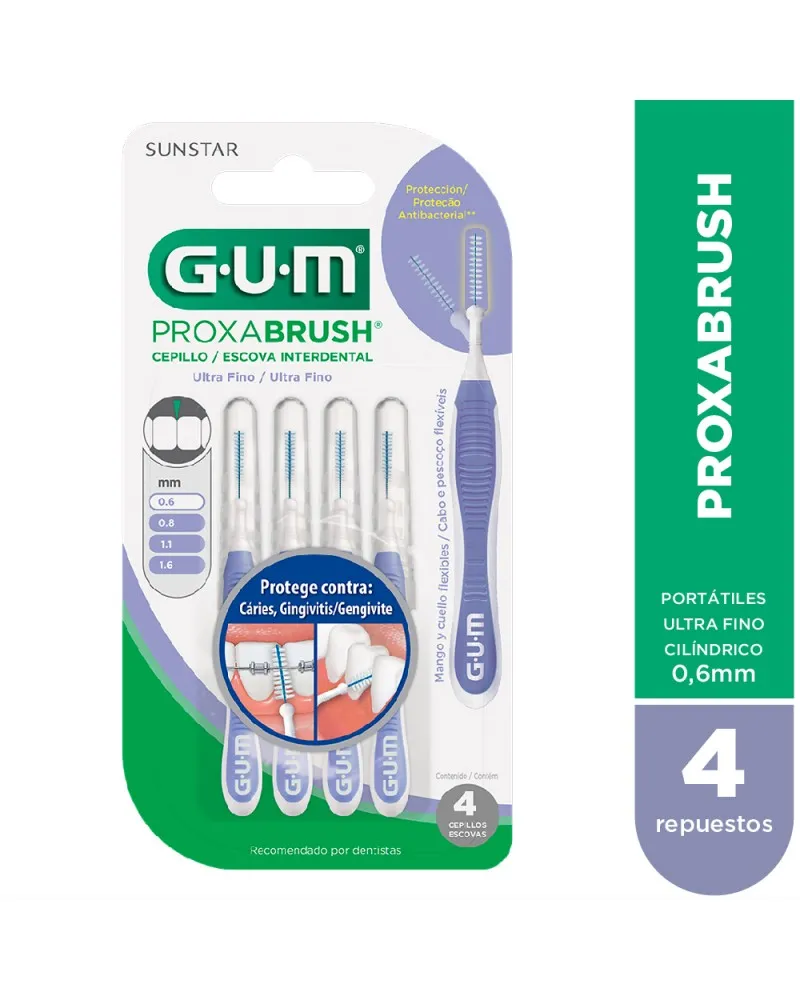 Los limpiadores Gum Proxabrush han sido clínicamente diseñados por los profesionales de la odontología para mover la placa dental de las áreas interdentales, a dónde a menudo los cepillos habituales no llegan. Como una alternativa popular y efectiva al hilo dental, los Gum Proxabrush son seguros y fáciles de usar para limpiar entre los dientes y alrededor de las coronas, puentes, implantes dentales y prótesis de ortodoncia. Los limpiadores Gum Proxabrush poseen una cabeza manufacturada con precisión con exclusivas cerdas triangulares que se ha probado remueven más placa dental que las habituales cerdas redondeadas.