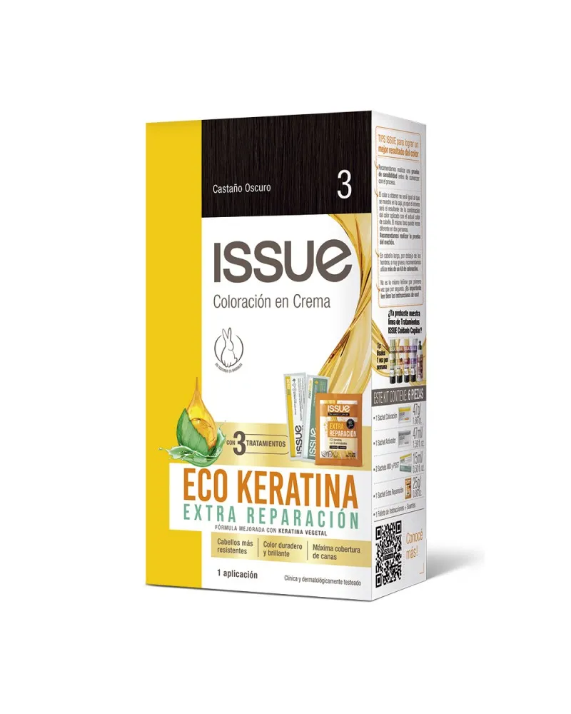 Eco Keratina Kit: Gracias a sus tratamientos MIX-color y Post-color con keratina vegetal. potencia la coloración mientras repara y refuerza la fibra capilar. RESULTADO DE COLOR Con el Eco Keratin Kit obtendrás luminosa intensidad del color y una mayor resistencia y restauración. Pre Coloración: El tratamiento MIXcolor con keratina vegetal refuerza la fibra capilar con una combinación de 8 amoniacos esenciales derivados de vegetales. La Coloración en Crema Issue provee la proporción justa para lograr una mezcla homogénea y el mejor resultado en tu cabello al mezclarlo con el Activador en Crema Issue Post Coloración: El Bálsamo Postcolor Issue es el complemento ideal para lograr un cabello con brillo y vitalidad luego de la coloración. El aporte de la Keratina brinda al cabello suavidad y sedosidad resaltando su belleza y color hasta la próxima aplicación.- ¿SABIAS QUÉ...? La keratina es el componente esencial del cabello y es la responsable de dar estructura, resistencia y brillo. Con la edad, los sucesivos tratamientos químicos (coloraciones, alisados), las altas temperaturas (planchitas, secadores) y los rayos solares, la keratina se va perdiendo y el cabello queda quebradizo, poroso y sin brillo.