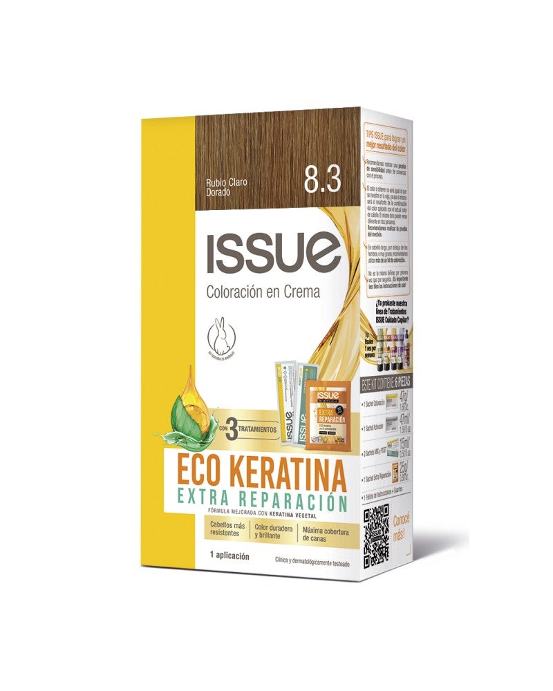 Eco Keratina Kit: Gracias a sus tratamientos MIX-color y Post-color con keratina vegetal. potencia la coloración mientras repara y refuerza la fibra capilar. RESULTADO DE COLOR Con el Eco Keratin Kit obtendrás luminosa intensidad del color y una mayor resistencia y restauración. Pre Coloración: El tratamiento MIXcolor con keratina vegetal refuerza la fibra capilar con una combinación de 8 amoniacos esenciales derivados de vegetales. La Coloración en Crema Issue provee la proporción justa para lograr una mezcla homogénea y el mejor resultado en tu cabello al mezclarlo con el Activador en Crema Issue Post Coloración: El Bálsamo Postcolor Issue es el complemento ideal para lograr un cabello con brillo y vitalidad luego de la coloración. El aporte de la Keratina brinda al cabello suavidad y sedosidad resaltando su belleza y color hasta la próxima aplicación.- ¿SABIAS QUÉ...? La keratina es el componente esencial del cabello y es la responsable de dar estructura, resistencia y brillo. Con la edad, los sucesivos tratamientos químicos (coloraciones, alisados), las altas temperaturas (planchitas, secadores) y los rayos solares, la keratina se va perdiendo y el cabello queda quebradizo, poroso y sin brillo.