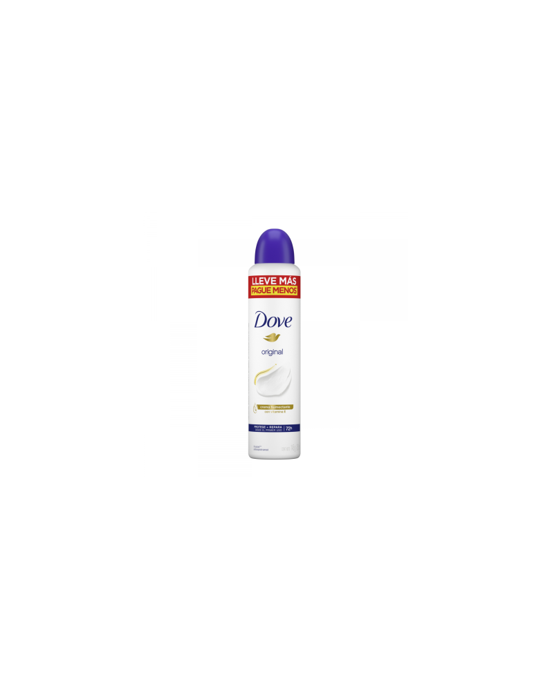 Sin importar lo que hagas, un antitranspirante confiable te ayudará a sentirte más segura siempre. Hecho con nuestro nuevo activo antitranspirante, el desodorante antitranspirante en aerosol Dove Original te protege por hasta 48 horas. La protección antitranspirante y el cuidado de las axilas se combinan con este aerosol suave para tu piel. Su fórmula contiene ¼ de crema humectante con óleo protector de origen natural que ayuda a hidratar la piel de tus axilas y es perfecto para el cuidado de la piel. Además, este efectivo antitranspirante elimina el sudor y el olor de las axilas durante 48 horas. Beneficios. 48 horas de protección y formulado con nuestra tecnología superior. Enriquecido con ¼ de nuestra crema humectante con óleo protector. Protección efectiva que es más suave para tu piel. Fórmula con 0% de alcohol. Un aroma clásico, fresco y delicado.