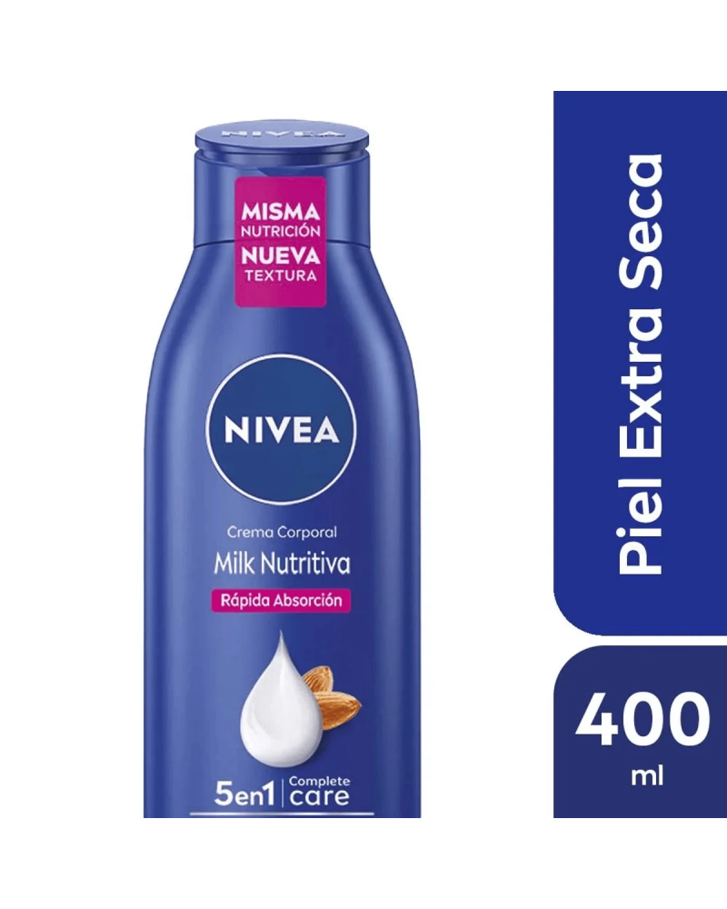 La Crema corporal NIVEA Milk Nutritiva ofrece 5 beneficios en 1: 48 horas de nutrición profunda, protección contra la sequedad de la piel, brinda suavidad en la piel, absorción rápida e instantánea y la piel luce visiblemente más saludable. Es ideal para pieles extra secas.