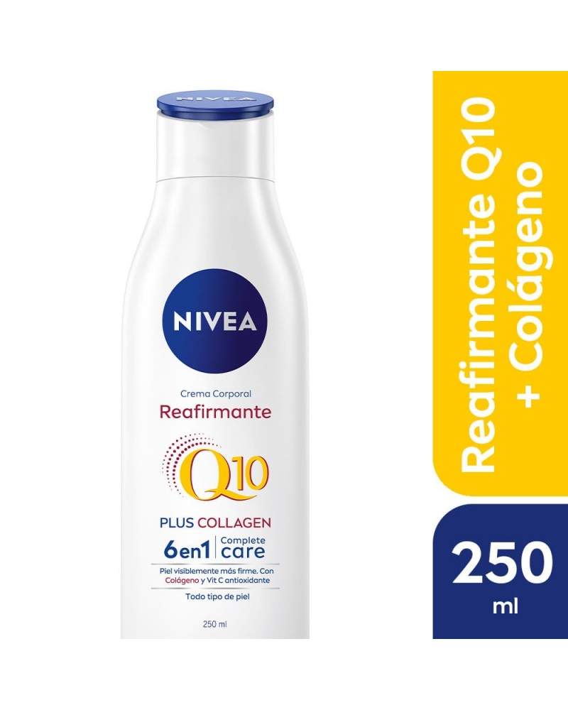La Crema corporal NIVEA Q10 + Colágeno ofrece 6 beneficios en 1: 48 horas de humectación profunda, poderosos antioxidantes: Vit C + Q10, rápida absorción, fácil aplicación, piel visiblemente más firme, elástica y radiante. Su fórmula combina Coenzima Q10, Colágeno y Vitamina C, tres ingredientes que hidratan profundamente la piel y la suavizan. Su textura ligera es ideal para todo tipo de piel.