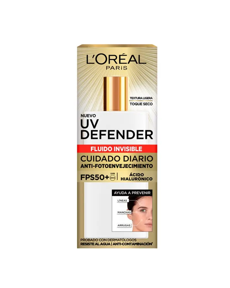 El nuevo UV Defender Fluido Invisible FPS50+ protege tu piel diariamente de los rayos UVB y UVA, evitando el cáncer de piel, y la aparición de manchas, arrugas y líneas de expresión. Su textura 11 veces más ligera lo hace apto para todo tipo de piel, incluso las pieles mixtas a grasas. Ahora también en tono claro y medio