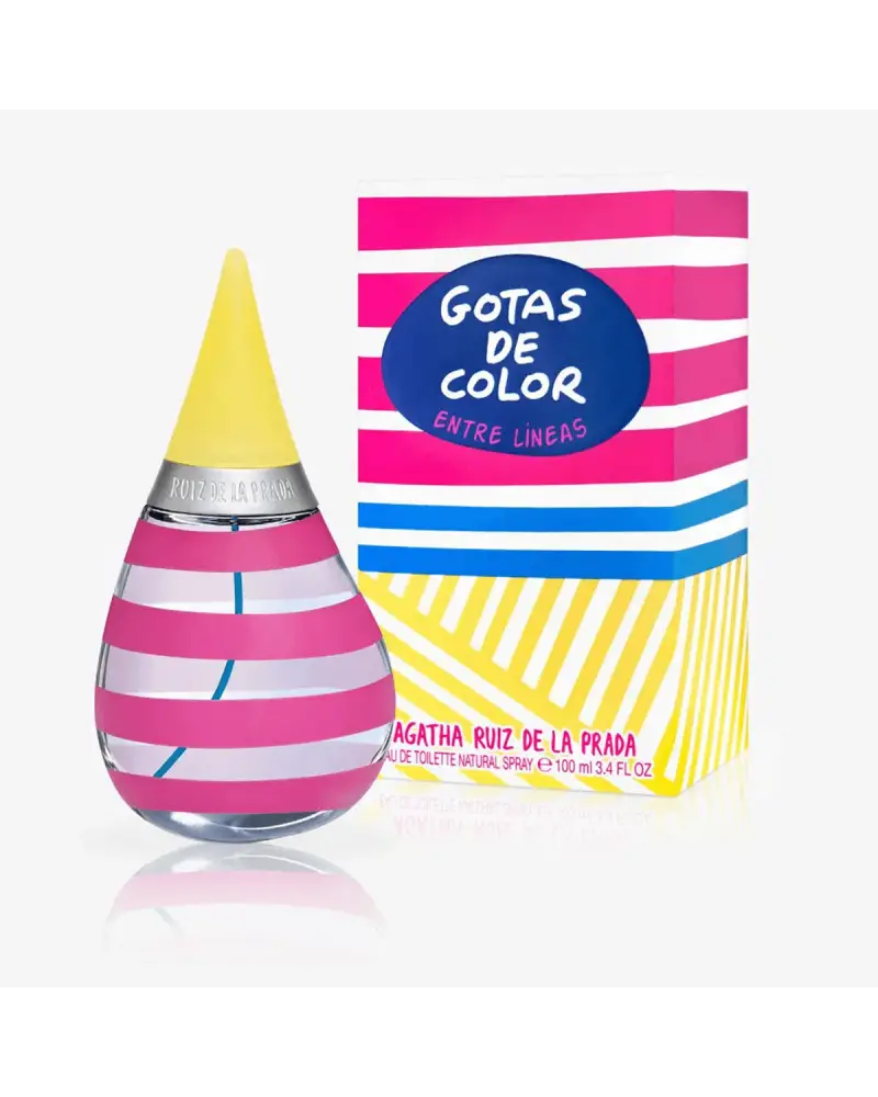Gotas de Color Entre Líneas de Agatha Ruiz de la Prada, una edicion limitada con un estampado divertido y vibrante a rayas de colores.Un tapón de un amarillo muy vivo y un cuerpo con vistosas rayas rosas entre las cuales podemos entrever un chispeante y fresco jugo en contraste con una cánula en azul marino.
