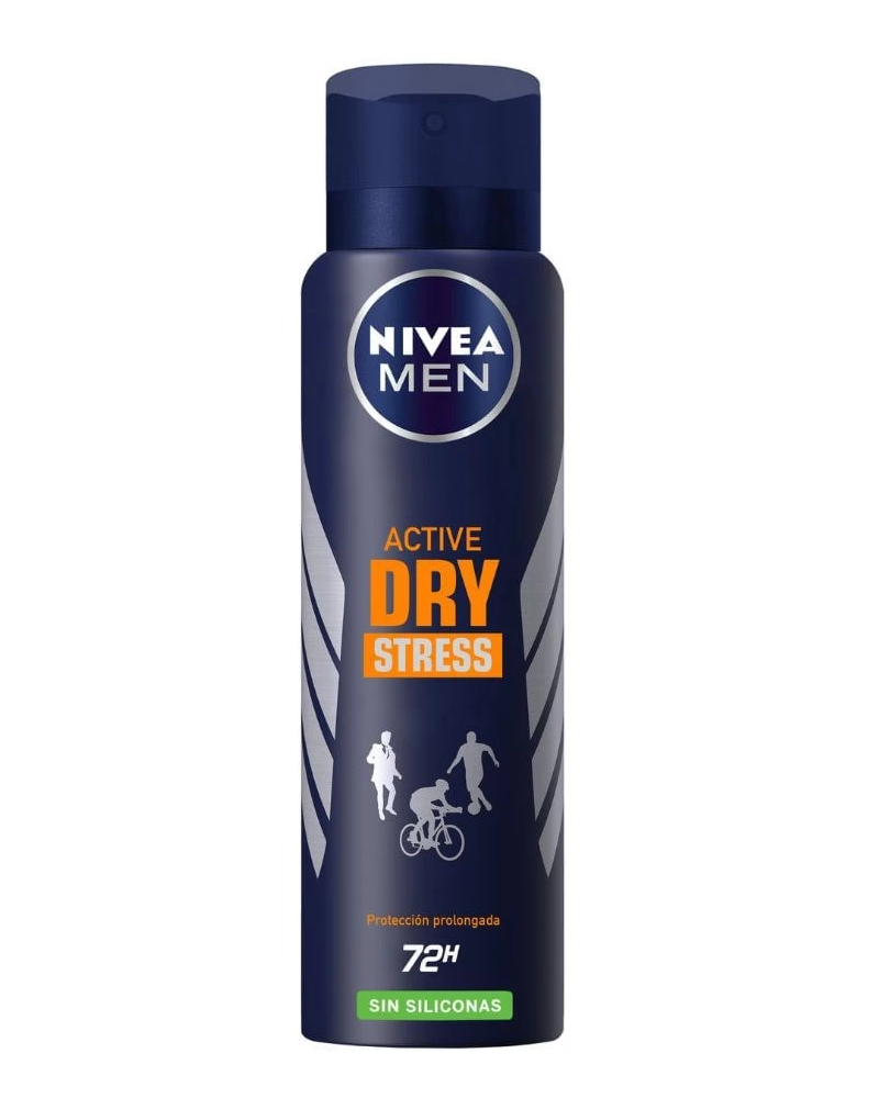 El Desodorante antitranspirante NIVEA MEN Active Dry Stress en aerosol y sin siliconas ofrece 48 horas de protección. Está científicamente probado que reduce hasta en un 50% la transpiración en momentos de estrés.