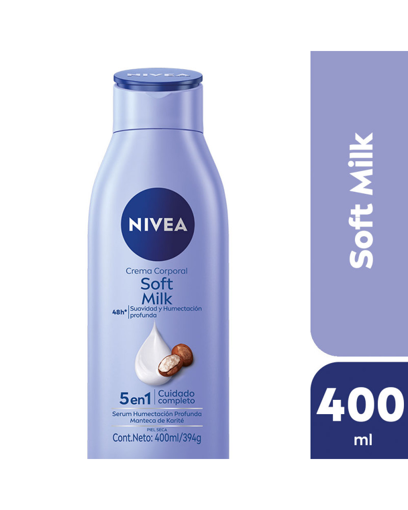 La Crema corporal Soft Milk 5 en 1 de NIVEA nutre la piel desde la primera aplicación gracias a su serum de humectación profunda y a su ingrediente principal: Manteca de Karité. Posee 5 beneficios en 1: 48 horas de humectación profunda, brinda un cuidado indulgente, rápida absorción, deja suave la piel y visiblemente más saludable.