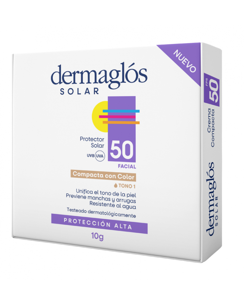 Crema Dermaglós Solar Compacta con Color FPS 50 Tono 1 10g.Crema compacta de fácil aplicación que protege el rostro de las radiaciones solares e hidrata sin oleosidad. Corrige imperfecciones, matifica y unifica el tono de la piel con un acabado natural.Su innovadora fórmula está especialmente desarrollada para prevenir los signos de envejecimiento causados por el sol brindando a la piel un efecto suave y aterciopelado.