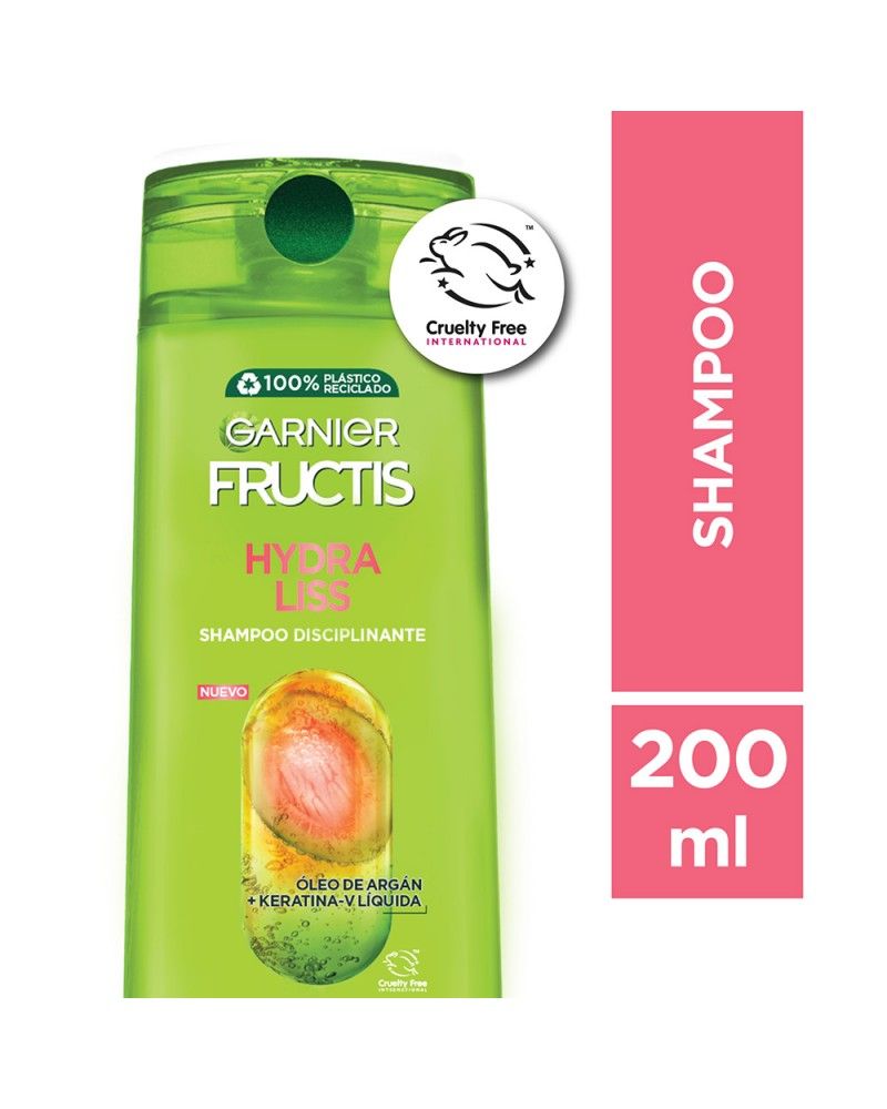 Cabello con frizz y fuera de control? Nuestro Shampoo Hydraliss enriquecido con un super duo de ingredientes. Nuestra tecnología con Keratina -V Liquida uniformiza la fibra para controlar el frizz hasta por 72 H. y se complementa con nuestras formulas de Oleo de Argan que hidratan y suavizan intensamente para un cabello brillante y manejable.NO PARABENOS.NO ACEITES MINEARLES.SI ANTI-SAL.SI 91% BIODEGRADABLE.Garnier está comprometido con Green Beauty. El shampoo Hydraliss tiene fórmula vegana, está aprobado por Cruelty Free International y sus botellas están hechas con plástico 100% reciclado.