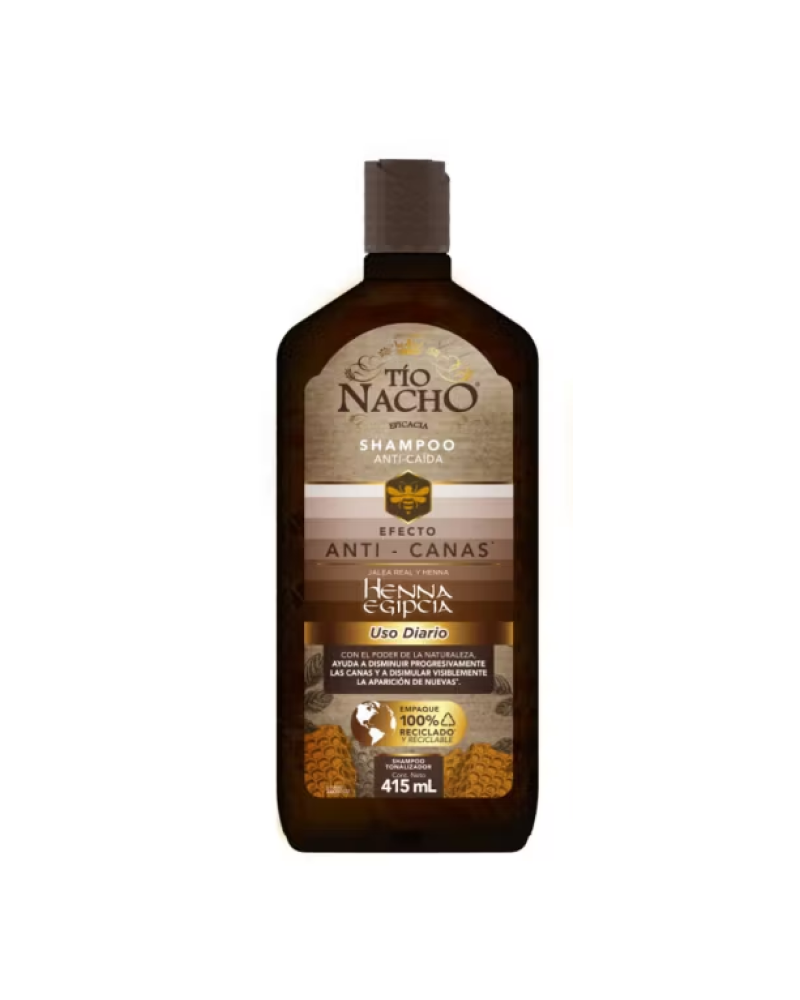 EFECTO ANTI-CANAS: La Henna es un ingrediente vegetal que ayuda a tonalizar el cabello de forma natural, ayuda a disminuir progresivamente las canas y disimulando visiblemente la aparición de nuevas.ANTI-CAÍDA: La Jalea Real es reconocida por su alto contenido de vitaminas y aminoácidos los cuales ayudan rejuvenecer el cabello aportando brillo, fortaleza y menos caída.Con el tiempo los folículos del cabello pierden melanina; por eso, su tono se vuelve gris y opaco. Semana a semana, Tío Nacho EFECTO ANTI-CANAS devuelve el tono progresivamente y ayuda a dar visiblemente una apariencia natural.