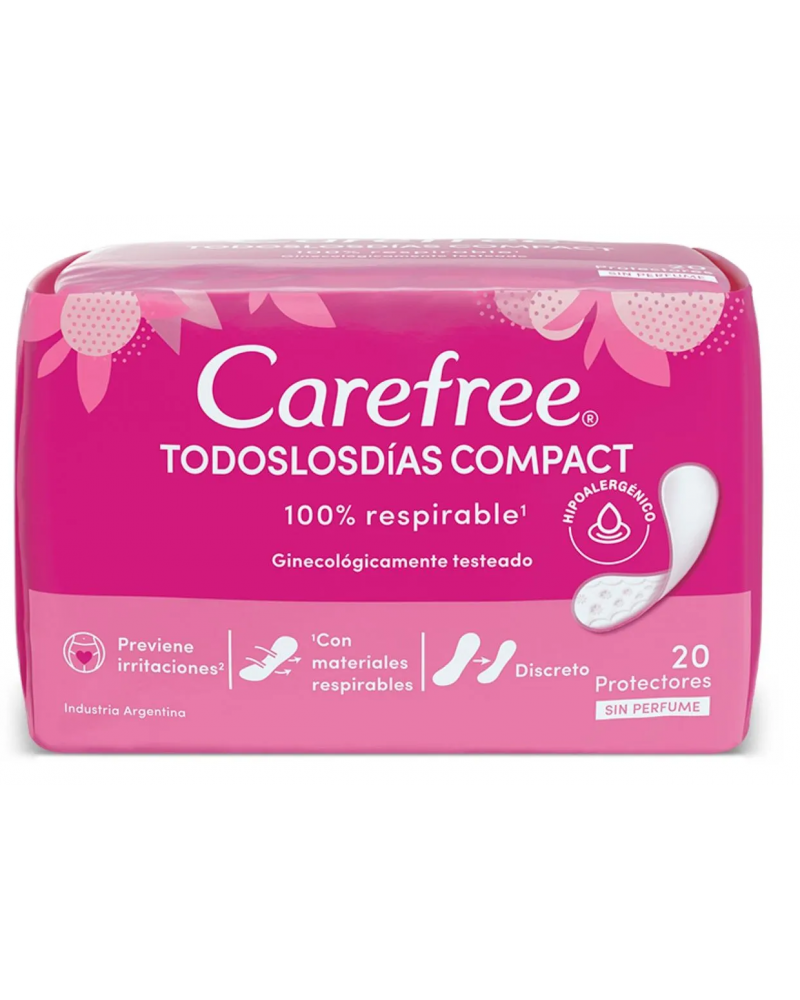 Los Protectores Diarios Todos Los Días Compact x 20 u, de Carefree son ideales para brindar protección durante todo el día para que te sientas cómoda y limpia gracias a su materiales 100% respirables. Sin perfume e hipoalergénico.