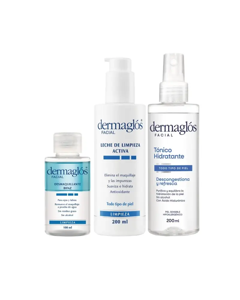 Un combo de 3 productos ideales para la limpieza integral del rostro, cuello y escote y para cualquier tipo de piel. Una rutina de 3 simples pasos para dejar la piel completamente limpia, hidratada y libre de impurezas como solo Dermaglós puede lograr.- Dermaglós Facial Leche de Limpieza Activa: El primer paso para cuidar tu piel es la limpieza. Elimina en profundidad el maquillaje y las impurezas diarias permitiendo a la piel respirar libremente sin dejar sensación de grasitud. Ideal para la limpieza facial de pieles sensibles.- Dermaglós Facial Tónico Hidratante Descongestivo: El Tónico Hidratante Descongestivo restaura y equilibra la hidratación de la piel completando el proceso de limpieza facial, dejándola purificada y fresca. Además tiene un efecto descongestivo, emoliente y suavizante.- Dermaglós Facial Desmaquillante Bifaz de Ojos: Su fórmula bifaz elimina fácilmente el maquillaje a prueba de agua y de larga duración otorgando a la piel una agradable sensación de suavidad sin dejar residuo graso. Delicada limpieza para todo tipo de piel.