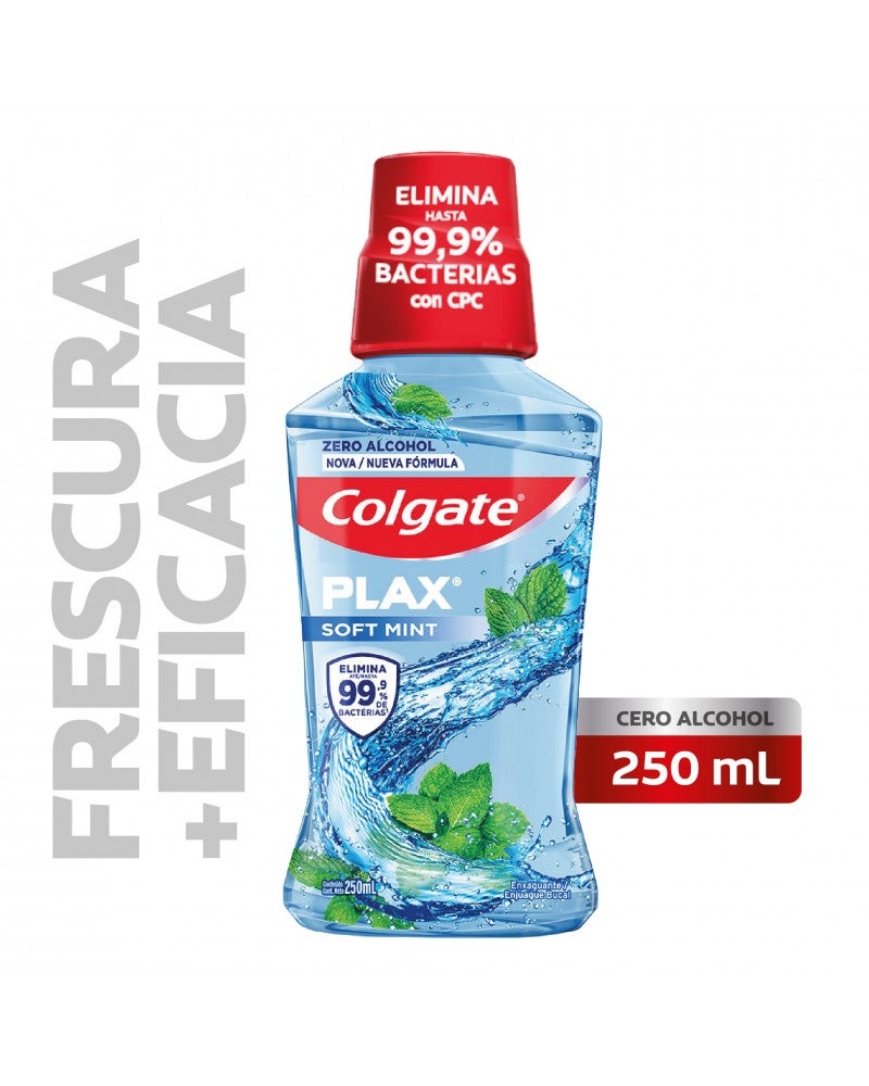 Experimenta una suave frescura con el enjuague bucal Colgate Plax Soft Mint con la eficacia del CPC, ingrediente que elimina hasta el 99.9% de las bacterias contribuyendo a una boca sana con aliento fresco. Este enjuague bucal sin alcohol cuidará tu sonrisa mientras te brinda más frescura** y sensación de limpieza. Mantén una buena salud bucal al incluir en tu rutina el enjuague Colgate Plax Soft Mint. Freshficacia, sensación de frescura continua y eficacia comprobada contra bacterias. Ayuda a reducir hasta el 99.9% de las bacterias anaeróbicas cultivables.