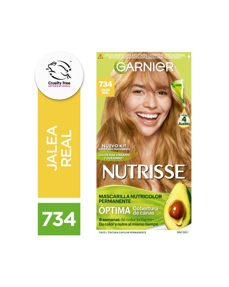 Nutrisse Coloracion 734 JALEA REAL. Nueva formula superior: Tecnología con colorantes de larga duración para un tono luminos y resistente al deslave hasta por 8 semanas. Exclusiva gota nutritiva: Con aceites hidratantes de uva para darte a tu cabello un shot de nutrición.