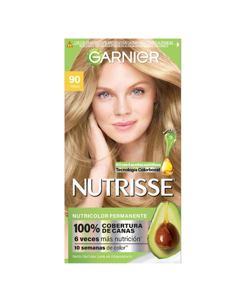 Nutrisse Coloracion 90 TRIGO. Nueva formula superior: Tecnología con colorantes de larga duración para un tono luminos y resistente al deslave hasta por 8 semanas. Exclusiva gota nutritiva: Con aceites hidratantes de uva para darte a tu cabello un shot de nutrición.