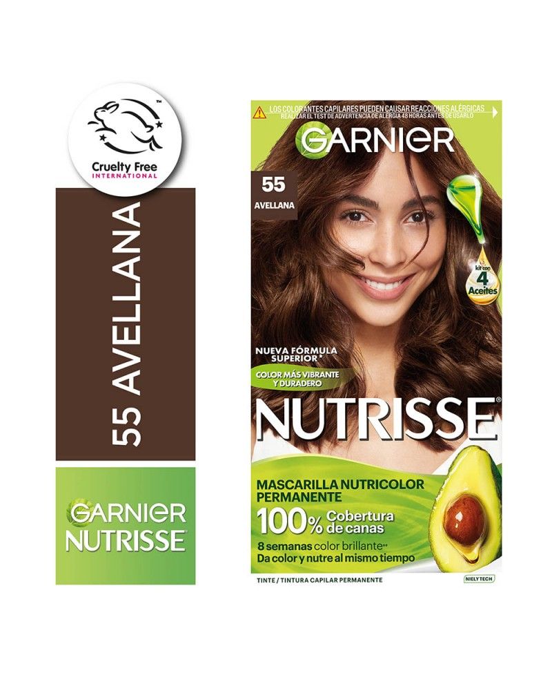 Logra un color radiante y duradero hasta por 6 semanas con nuestra tintura 55 color avellana y goza del poder de 4 aceites (aguacate, oliva, uva y grosella). Descubrí la tintura de color avellana que Garnier Nutrisse tiene para vos