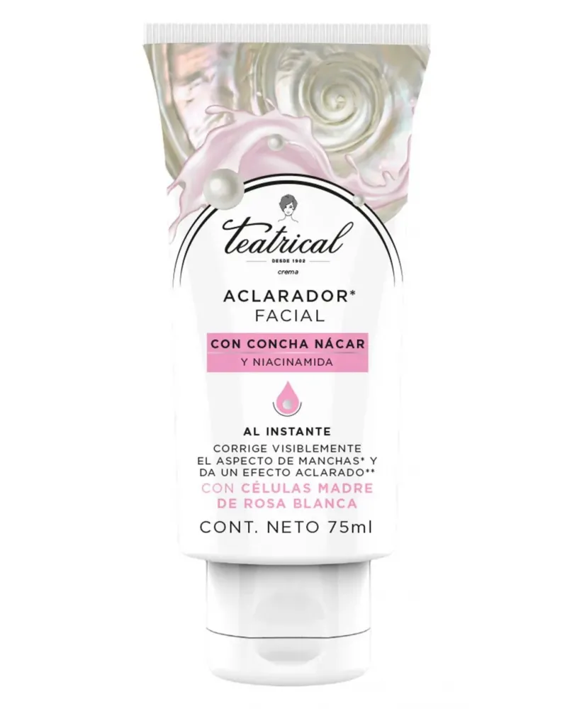 Teatrical Crema Facial Aclaradora formulada con concha nácar, niacinamida y células madre de rosa blanca. - Corrige visiblemente el aspecto de manchas y da un efecto aclarado. - Despigmenta desde el día 6. - Efecto Instantáneo.