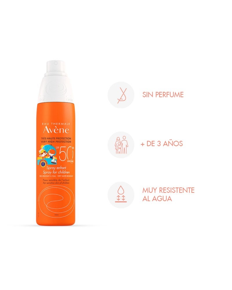 Muy alta protección solar para las pieles sensibles de los niños. Rostro y cuerpo.Beneficios.El Spray niños SPF 50+ se basa en la exclusiva asociación SUNSITIVE® PROTECTION, resultado de la investigación de Pierre Fabre.1. Sistema de filtros patentado que contiene solo 4 filtros solares para una muy amplia protección UVB-UVA fotoestable y eficaz a lo largo del tiempo, y una tolerancia cutánea óptima.2. Complejo antioxidante único (Pre-Tocoferil + Tialidina) para la protección celular global contra el estrés oxidativo.3. Agua termal de Avène, conocida por sus propiedades calmantes, anti-irritantes y suavizantes.El Spray niños SPF 50+ tiene un NUEVO SISTEMA OPEN / STOP para que sea más práctico y respetuoso con el medio ambiente:OPEN: girar y aparecerá la boquilla.STOP: girar y desaparecerá la boquilla.Los productos solares no proporcionan una protección total contra los rayos UV.Gracias a su NUEVA TEXTURA barrera anti-agresión*, el Spray niños SPF 50+ ofrece:- Textura fluida, ligera y fácil de aplicar.- Película protectora reforzada para proteger la piel de los niños de las agresiones externas.- Fórmula muy resistente al agua.Modo Uso.Antes de exponerse al sol, aplicar generosamente el Spray SPF 50+ Niños en el rostro y/o cuerpo del niño (Por ejemplo 3-4 sprays de media sobre el antebrazo.Composición.La lista de ingredientes puede estar sujeta a modificaciones, aconsejamos verificar la lista que aparece en el producto comprado.avene thermal spring water (avene aqua). C12-15 alkyl benzoate. Coco-caprylate/caprate. Methylene bis-benzotriazolyl tetramethylbutylphenol [nano]. Diisopropyl adipate. Water (aqua). Bis-ethylhexyloxyphenol methoxyphenyl triazine. Diethylhexyl butamido triazone. Polyglyceryl-2 dipolyhydroxystearate. Glycerin. Butyl methoxydibenzoylmethane. Decyl glucoside. Benzoic acid. Butylene glycol. Caprylic/capric triglyceride. Caprylyl glycol. Disodium edta. Helianthus annuus (sunflower) seed oil (helianthus annuus seed oil). Hydroxycapric acid. Lauryl glucoside. Oxothiazolidine. Propylene glycol. Sodium benzoate. Sodium citrate. Sodium lauryl glucose carboxylate. Sorbic acid. Tocopherol. Tocopheryl glucoside. Xanthan gum.Presentación.200Ml.
