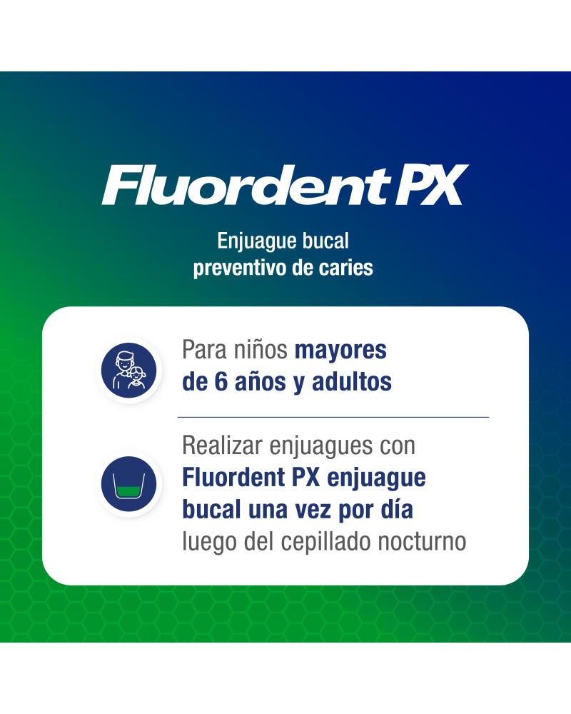 Fluordent PX Enjuague Bucal brinda una completa protección anticaries. Su uso diario después del cepillado ayuda a fortalecer el esmalte dental, prevenir caries y mantener un aliento fresco por más tiempo. Fluordent PX Enjuague Bucal contiene fluoruro de sodio (226 ppm de ion flúor), pirofosfatos y xilitol (endulzante no cariogénico). - Es apto para celíacos - Con sabor menta fresca