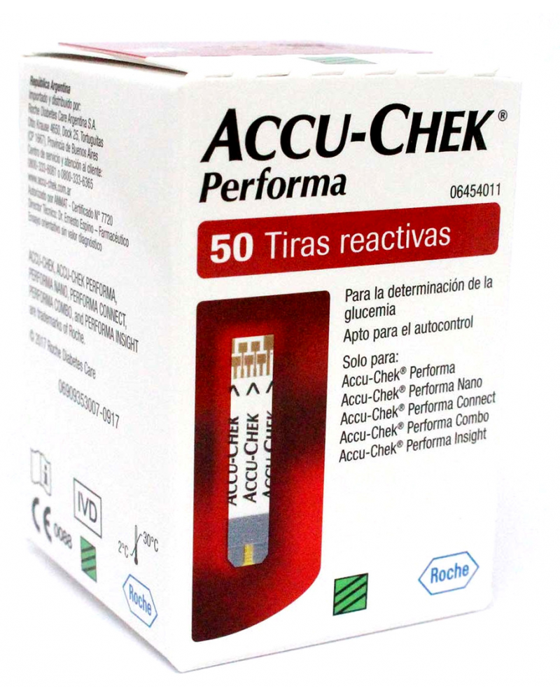 Tiras reactivas de Accu-Chek Performa x50, compatibles con los glucómetros de la línea Accu-Chek Performa.