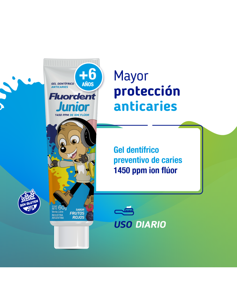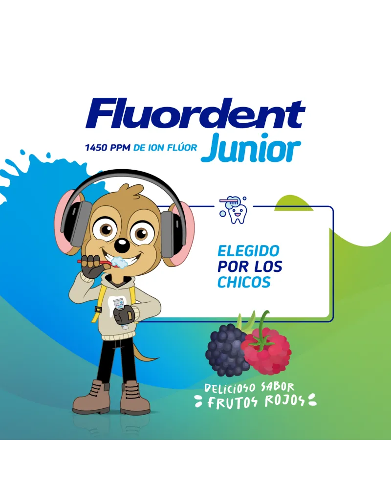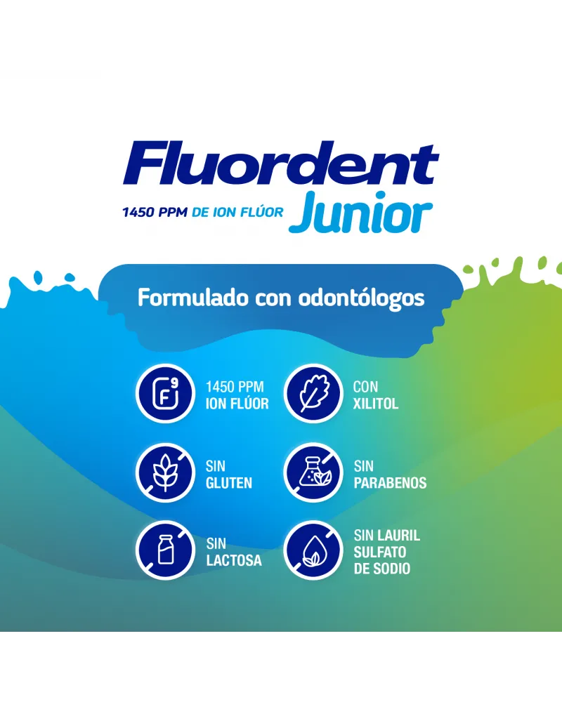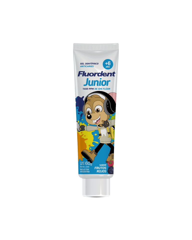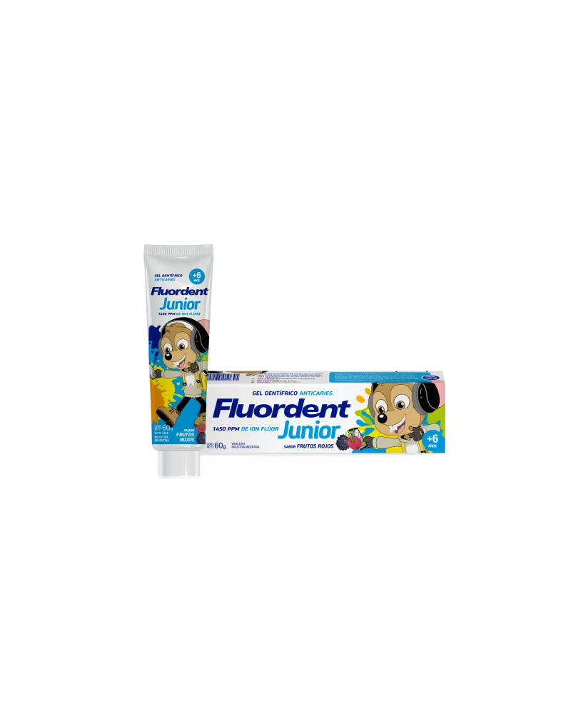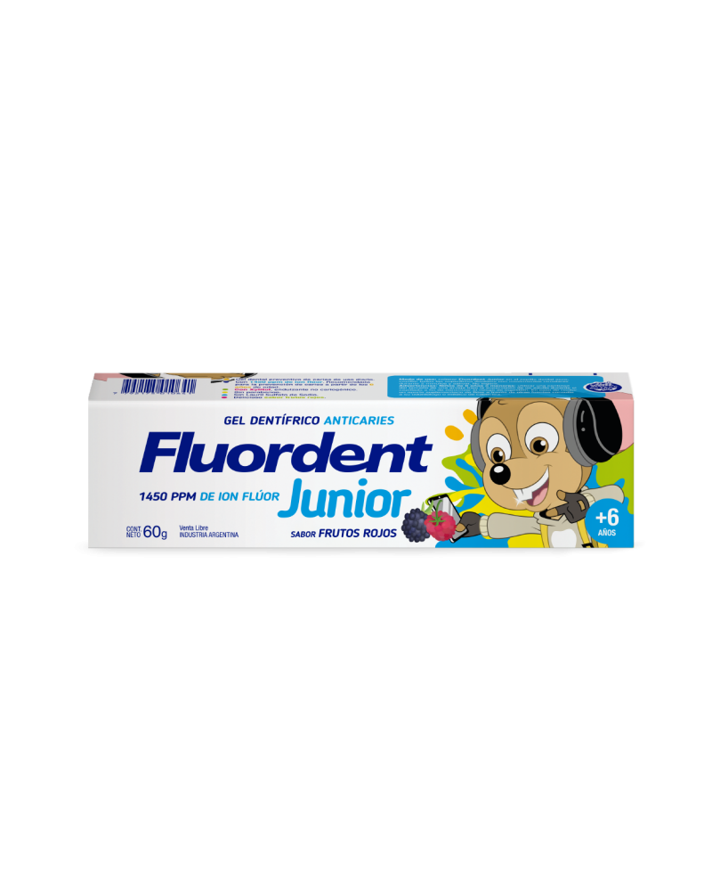 Fluordent Junior es un gel dental preventivo de caries de uso diario con 1450 ppm de ion flúor. Recomendada a partir de los 6 años de edad. Con xilitol, endulzante no cariogénico. Sin parabenos, sin gluten, sin lauril sulfato de sodio. Delicioso sabor frutos rojos.