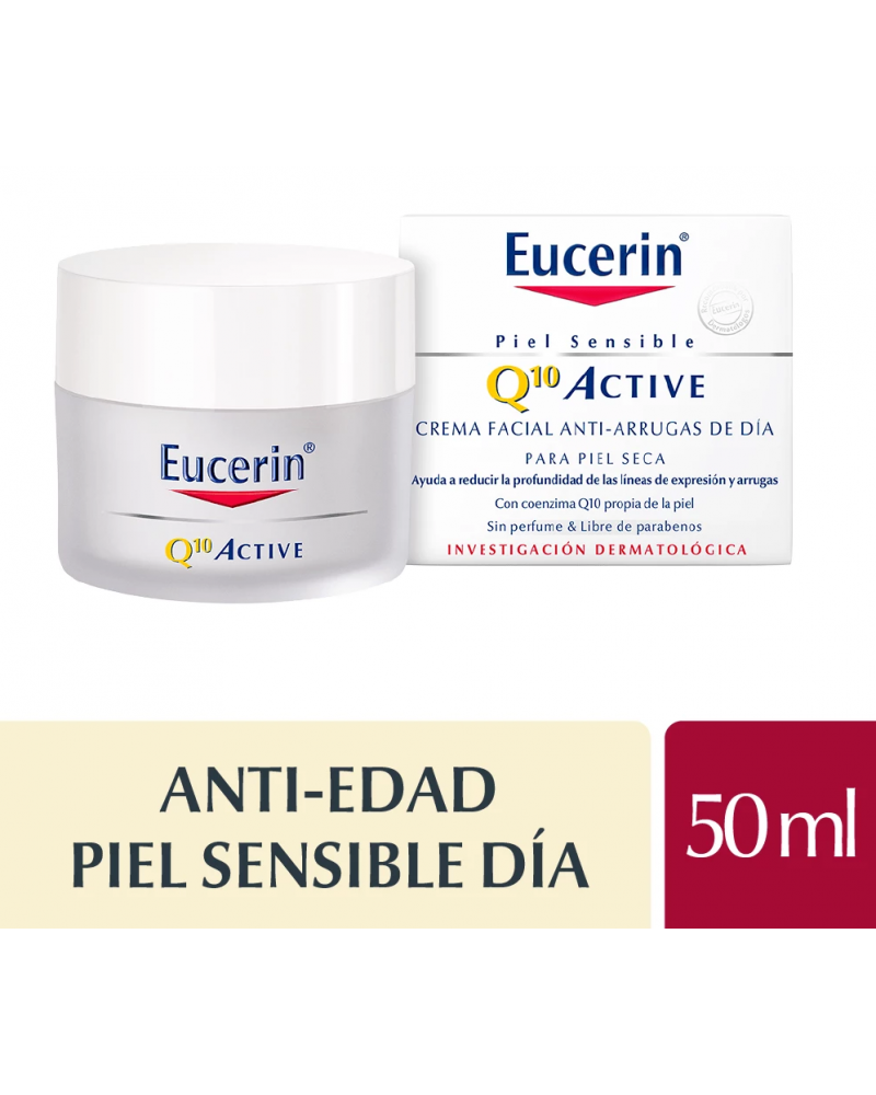 Eucerin Q10 ACTIVE Crema de Día está especialmente desarrollada con la Coenzima Q10 energizadora celular, una sustancia naturalmente presente en la piel que disminuye con el tiempo para contrarrestar los signos de envejecimiento como las arrugas o la piel sensible (estudios in vitro). Los antioxidantes Vitaminas C, E y H (biotina) nutren la piel seca y reducen la inflamación, para que la piel esté mejor protegida contra el ataque de los radicales libres. Desarrollada sin fragancia, colorantes artificiales ni alcohol, para la piel seca y sensible que se irrita con facilidad. Con el uso regular la piel luce más suave y firme. Sin parabenos ni colorantes artificiales para proporcionar una buena tolerabilidad cutánea.