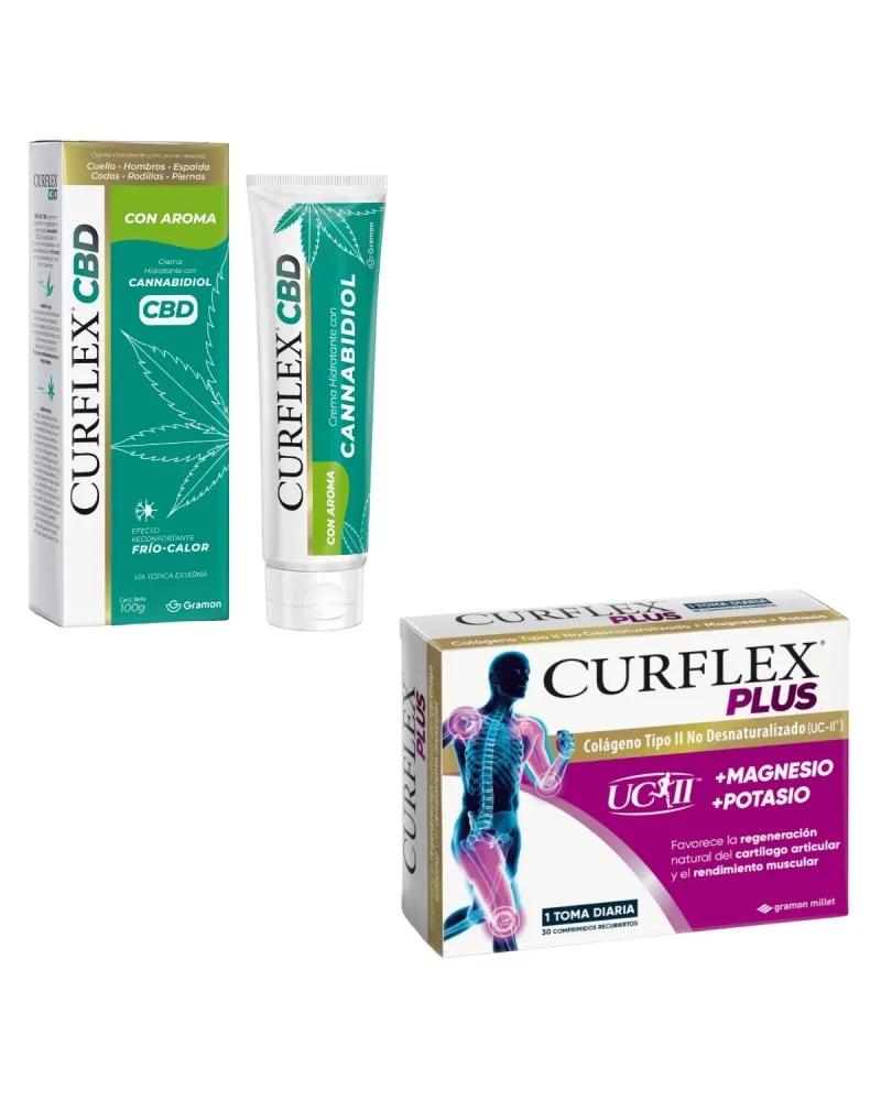 Este combo incluye: CURFLEX® Plus: Suplemento articular con colágeno en comprimidos. CURFLEX® CBD: Crema hidratante con Cannabidiol, ideal para cuidado muscular y articular.