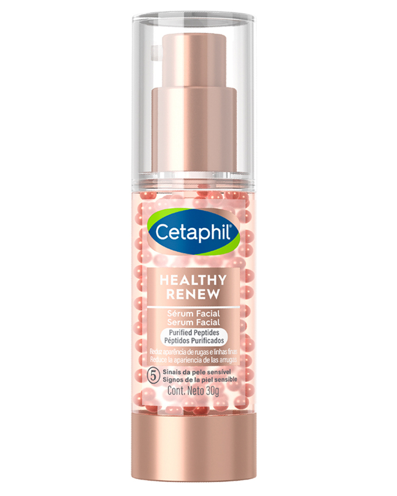 Máximo poder antiedad con una fórmula suave para piel sensible El Sérum Facial Antiedad Cetaphil Healthy Renew es una solución avanzada que combina Péptidos Purificados, Vitamina B3, Pro-Vitamina B5 y extractos botánicos para estimular la producción de colágeno, aportar luminosidad y mejorar la uniformidad de la piel. Su fórmula de rápida absorción hidrata profundamente durante 24 horas, restaurando la barrera cutánea y combatiendo los signos del envejecimiento sin irritar la piel.