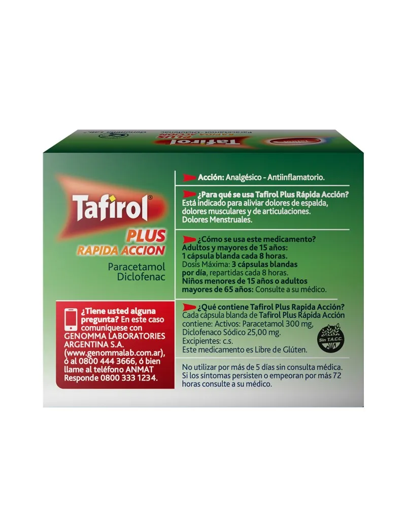 Tafirol Plus es una fórmula única de Tafirol en capsula blanda de rápida acción con el PLUS de un antiinflamatorio para aliviar dolores más intensos. Su fórmula contiene Paracetamol 300 mg y Diclofenac 25 mg indicado para dolores; musculares, de espalda, menstruales y articulares. Antinflamatorio y Analgésico.
