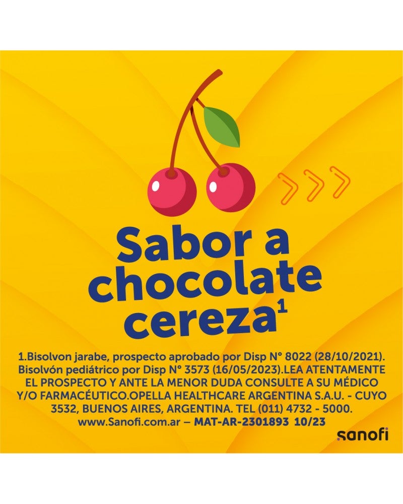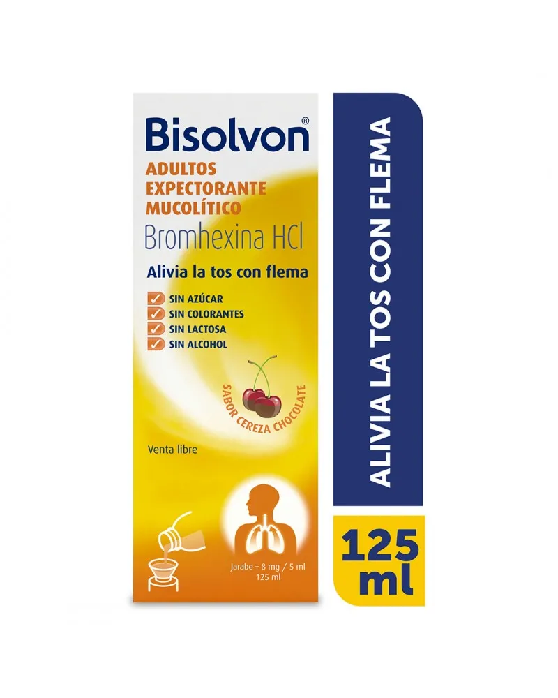 Bisolvon® jarabe contra la tos con flema, contiene el ingrediente activo Clorhidrato de Bromhexina, Maltitol líquido, sucralosa, ácido benzoico, aroma de cereza, aroma de chocolate, mentol y agua purificada. Reduce la viscocidad de mocos y flemas, facilitando su expulsión, en resfrios y gripes.