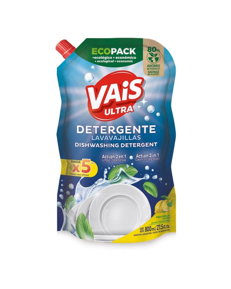 Vais Ultra Detergente para Vajillas posee una poderosa fórmula doble acción que te ayudará con la limpieza diaria de tu vajilla. Limpia y desengrasa, al mismo tiempo que protege tus manos. El detergente Vais deja una agradable fragancia a limón. Remueve hasta la grasa más difícil y quita las bacterias que quedan de la carne, pescados, salsas y todo tipo de resto de comida. El Detergente Vais Ultra es 5 veces más efectivo que los lavavajillas regulares.