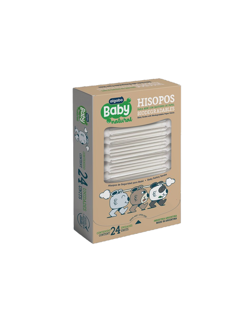 Son hisopos con forma de bastoncillo de papel acabado en una punta 100% algodón. Su uso está especialmente dedicado a la limpieza la oreja del bebé. Sus compuestos son 100% biodegradables, lo que ayuda a cuidar el ambiente. Mantiene limpio la parte externa de la orejita del bebé, de forma segura, suave y confortable