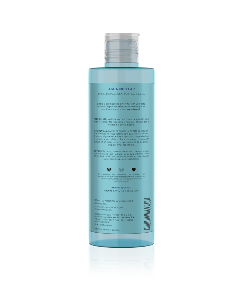 - Fórmula mejorada para desmaquillar, limpiar impurezas y calmar la piel. - Con Agua Termal del Volcán Copahue. - Testeada dermatológicamente para rostro y zona ocular. - Hipoalergénico | Cruelty Free | No contiene ingredientes de origen animal. - Sin fragancias | Sin parabenos | Sin aceites | Sin colorantes.