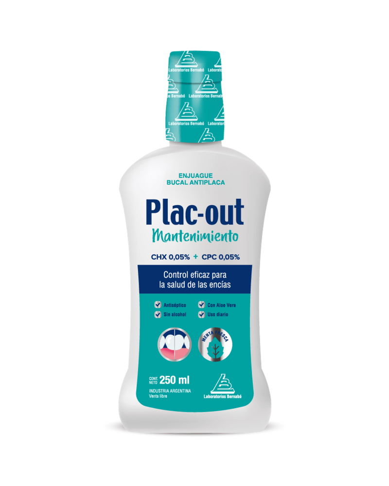 Plac-out Mantenimiento es un enjuague bucal antiplaca que ayuda a un control eficaz para la salud de las encías. Su fórmula contiene agentes que ayudan a prevenir la formación de placa bacteriana e incorpora aloe vera que facilita el saneamiento natural de las encías.