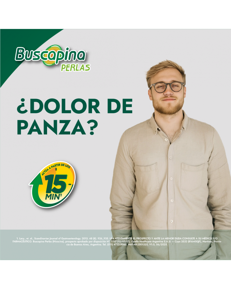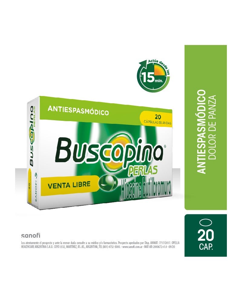 Buscapina Perlas x20 contiene butilbromuro de hioscina, un antiespasmódico eficaz para aliviar espasmos abdominales, cólicos intestinales y molestias por tensión gastrointestinal. Presentación en cápsulas blandas de acción rápida.