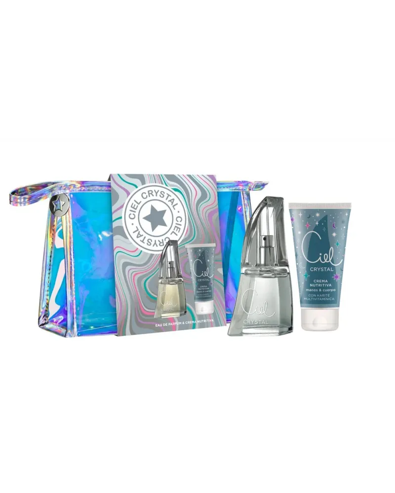 CIEL - Crystal Neceser Eau de Parfum 50 ml + Crema de Manos 85 g .Un dúo perfecto para realzar tu día a día con elegancia y frescura. CIEL Crystal combina una fragancia sofisticada y femenina con el cuidado que tus manos merecen. Eau de Parfum (50 ml): Una esencia envolvente y luminosa con notas florales y toques suaves de frutas y almizcles, ideal para mujeres que buscan dejar una huella sutil pero inolvidable. Crema de Manos (85 g): Textura suave y de rápida absorción que hidrata intensamente, dejando la piel sedosa y delicadamente perfumada. Presentado en un práctico y elegante neceser, este set es perfecto para regalar o para llevar tu toque personal a todas partes.