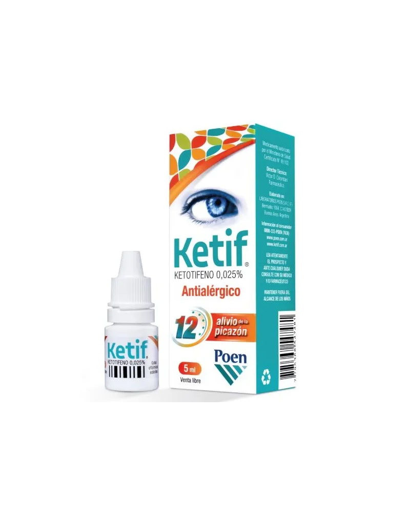 Ketif Solución Oftálmica 5 ml es un medicamento de venta libre utilizado para aliviar los síntomas de la alergia ocular, como picazón, enrojecimiento, lagrimeo y párpados inflamados. Su principio activo es el ketotifeno al 0,025%, un antihistamínico que actúa bloqueando los efectos de la histamina, sustancia responsable de las reacciones alérgicas.