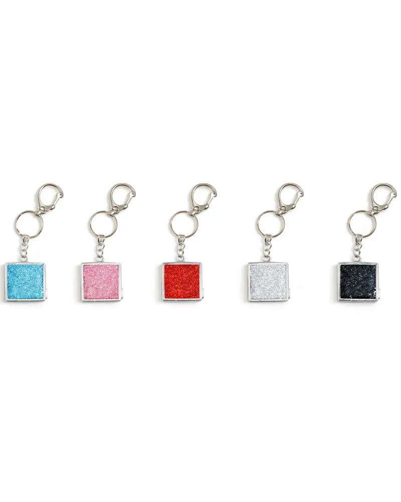 Espejo llavero de formato cuadrado, compacto y funcional, ideal para llevar en llaves, carteras o mochilas. Su diseño práctico permite realizar retoques rápidos de maquillaje o cuidado personal en cualquier momento. Cuenta con aro metálico resistente y un acabado decorativo moderno, convirtiéndolo en un accesorio útil y atractivo, también ideal para regalar.