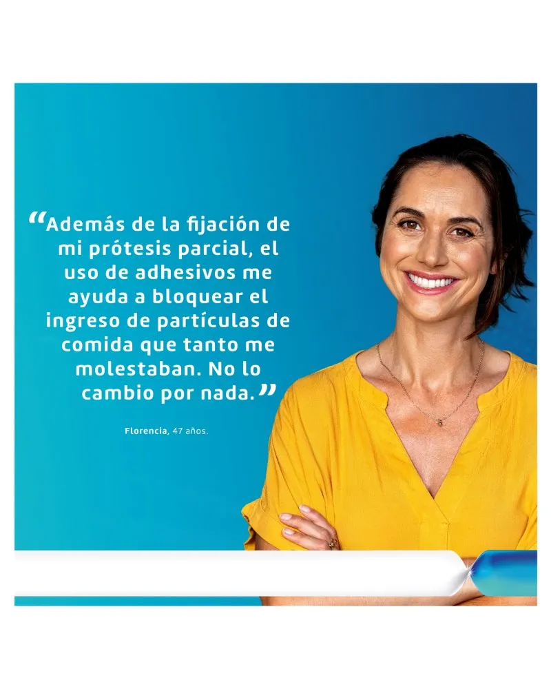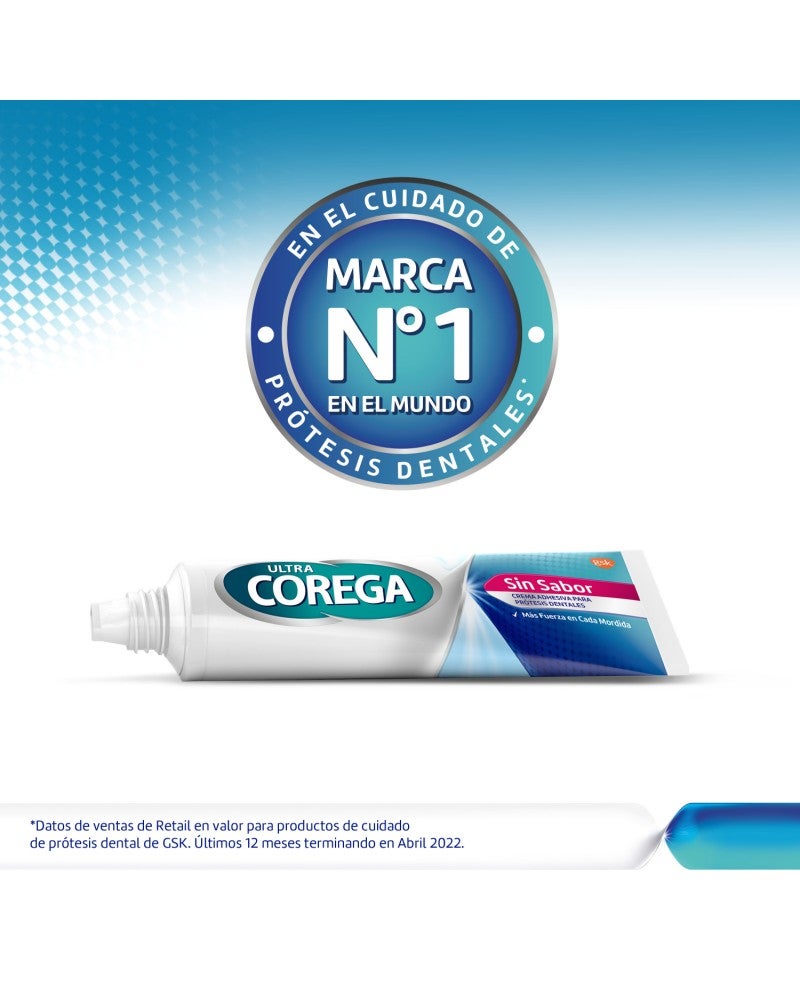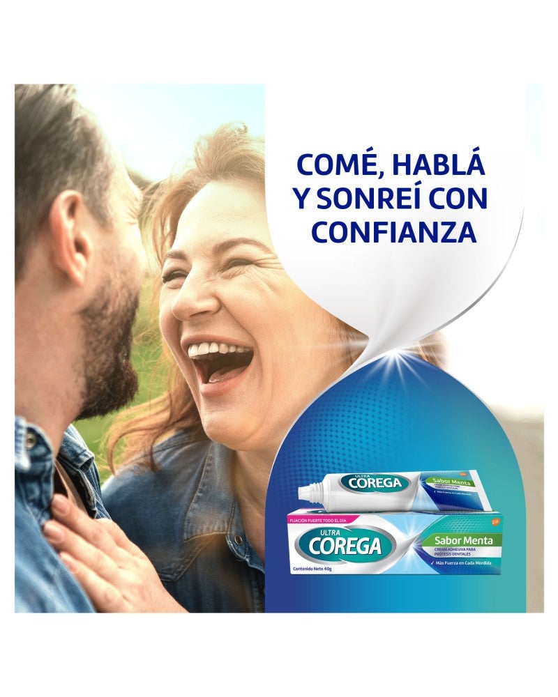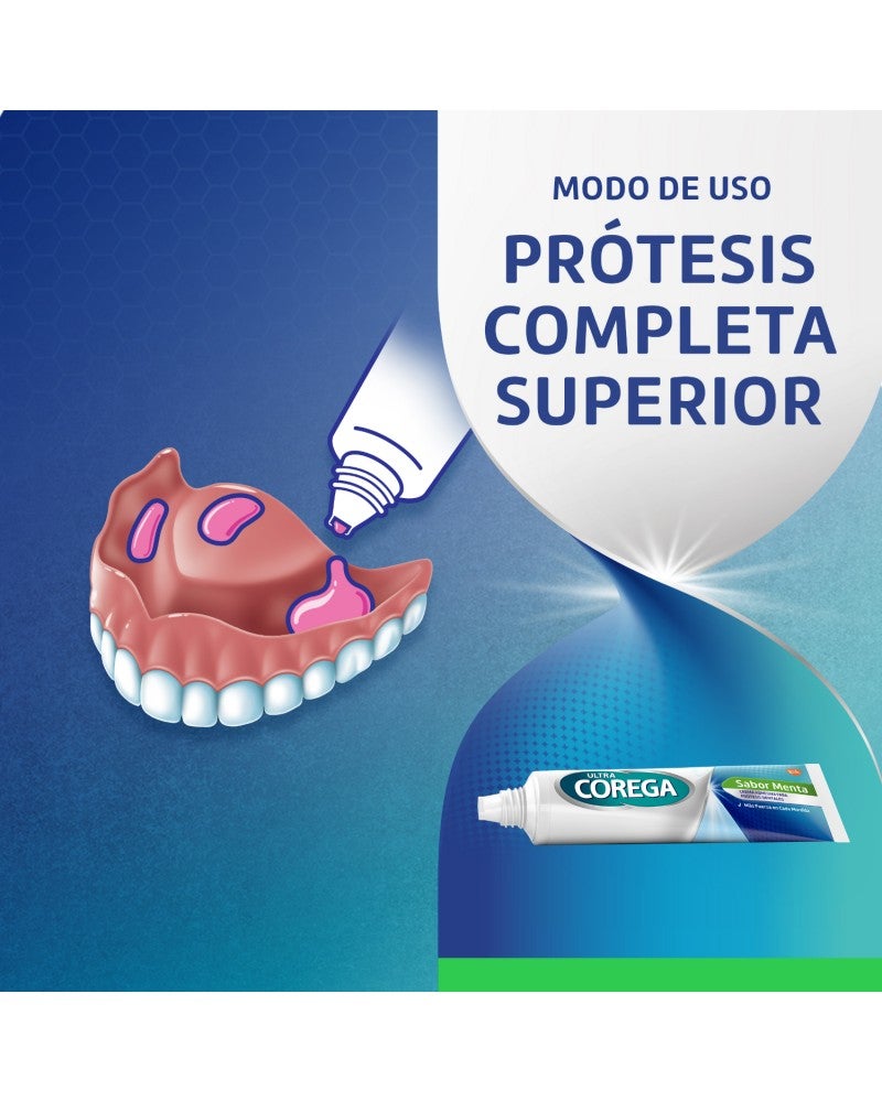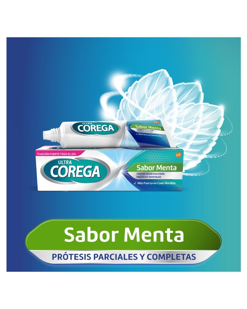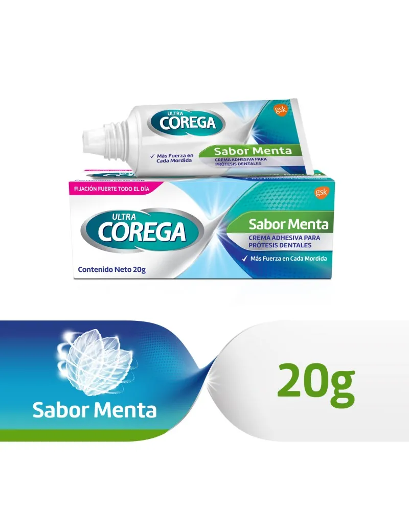 El adhesivo para prótesis dentales Ultra Corega Crema sabor menta 20g. fija la prótesis hasta por 12 horas. Además forma un sello entre la prótesis y la encía previniendo la entrada de partículas de comida • Fija la prótesis hasta por 12 horas. •Otorga mayor ajuste y comodidad. • Crea un sello que bloquea el ingreso de partículas de comida entre la prótesis y la encía. • Ayuda a prevenir la irritación de las encías. • No contiene colorantes ni saborizantes artificiales. • Contiene un fresco sabor a menta.