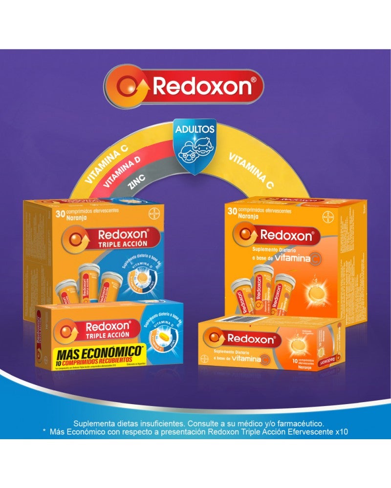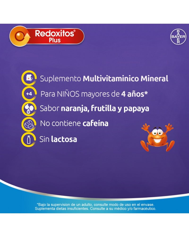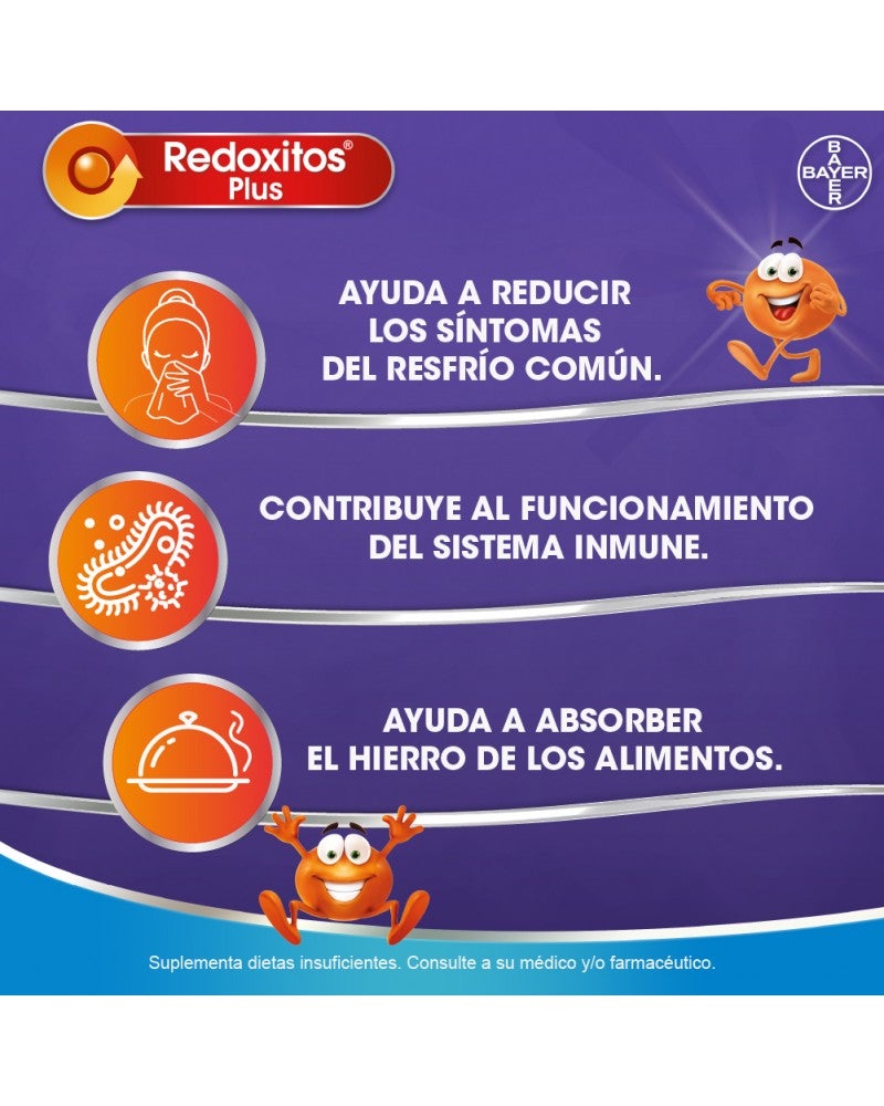 "Redoxitos Plus de Bayer con su fórmula avanzada de Vitamina C, Vitamina D y Zinc ayuda a fortalecer las defensas de los niños frente a los desafios de todos los dias de tres maneras: - La Vitamina C: Ayuda a disminuir la severidad e intensidad de los sintomas del resfrio comun y gripe. - El Zinc trabaja en sinergia con la Vitamina C manteniendo sólida a la barrera de la piel y luego colabora en la formación de anticuerpos. - La Vitamina D es fundamental para lograr una piel y huesos saludable pero también cumple un rol crucial en ayudar a la activacion las células del cuerpo para combatir infecciones. Su innovador formato en pastillas masticables, sabor naranja frutilla y papaya, facilita la tarea de los padres, ya que los chicos disfrutaran al comerlo, mientras el producto ayuda a reforzar su sistema inmune. Redoxitos Plus los ayuda a estar mejor preparados para enfrentar sus desafíos cotidianos y poder jugar, explorar y divertirse."