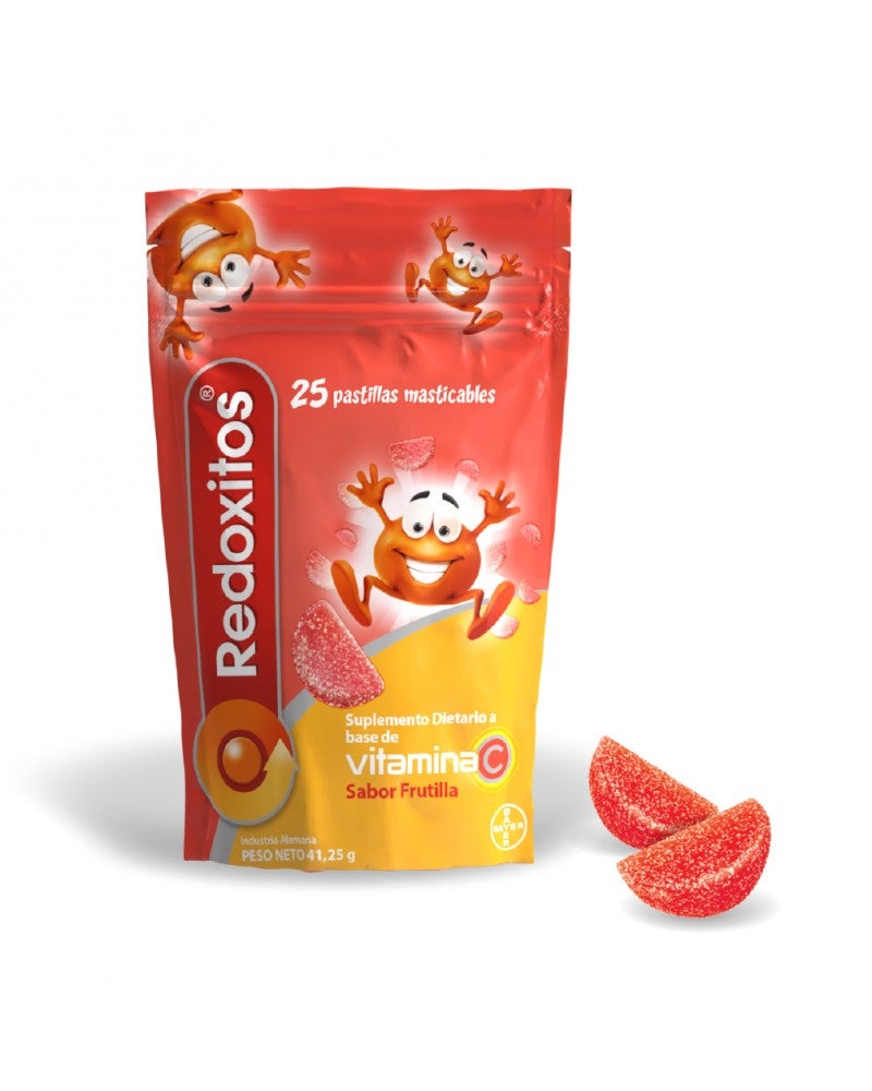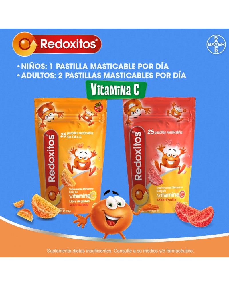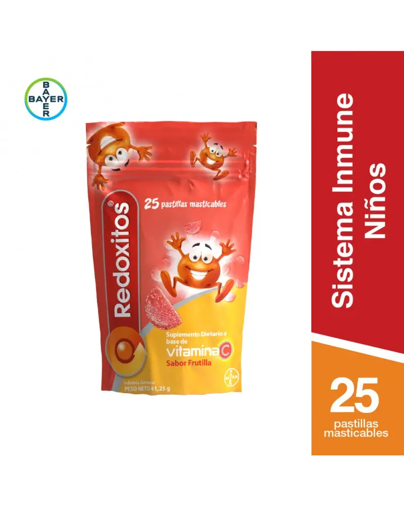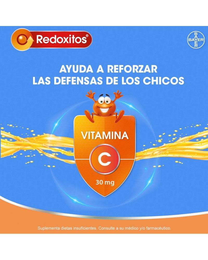 "Redoxitos de Bayer ayuda a fortalecer las defensas de los niños frente a los desafios de todos los dias de manera practica y rica. Cada pastilla de Redoxitos contiene la dosis adecuada de Vitamina C que ayuda a tu hijo a mantenerse saludable y estar protegido durante todo el año. Su innovador formato en pastillas masticables, sabor frutilla, facilita la tarea de los padres, ya que los chicos disfrutaran al comerlo, mientras el producto, gracias a la Vitamina C, ayuda a reforzar su sistema inmune y ayuda a disminuir la severidad e intensidad de los sintomas del resfrio comun y gripe. Redoxitos los ayuda a estar mejor preparados para enfrentar sus desafíos cotidianos y poder jugar, explorar y divertirse."