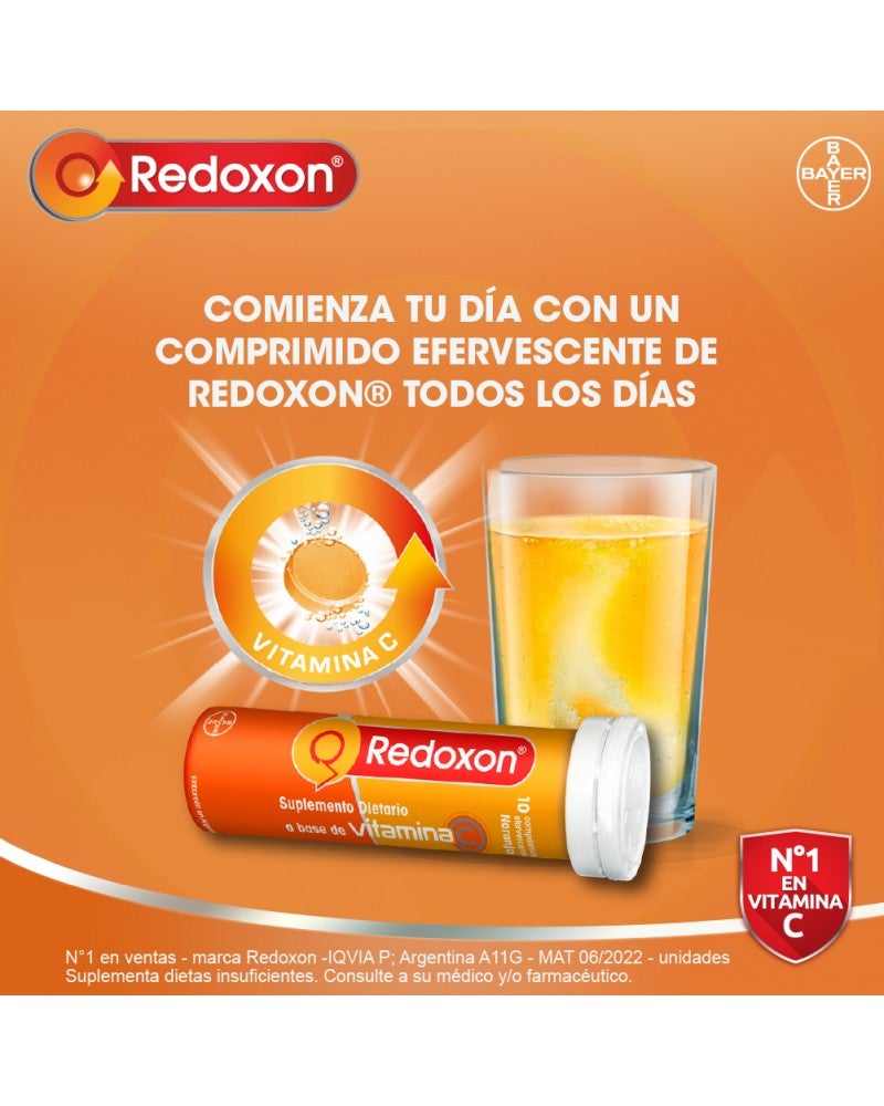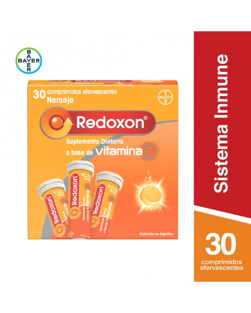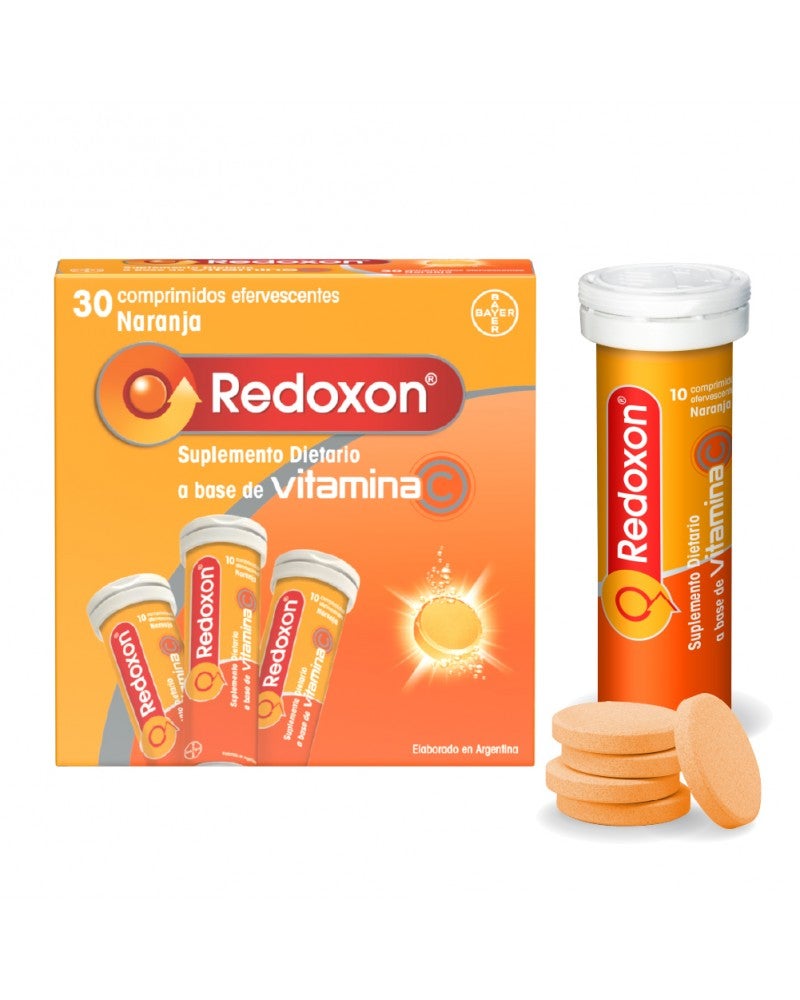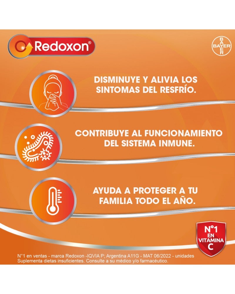 "Redoxon de Bayer contiene la dosis necesaria de Vitamina C que ayuda a fortalecer tus defensas y colabora a la disminucion y alivio más rápido de los síntomas del resfrío común. ¿Por qué tomar Vitamina C? Beneficios: - Ayuda a fortalecer tus defensas. - Colabora a la disminucion y alivio más rápido de los síntomas del resfrío común. - Interviene en la producción del colágeno, que es la proteína fundamental para tener una piel sana y fuerte. - Favorece la absorción de hierro. - Ayuda en la cicatrización de la piel. - Favorece la degradación de colesterol. - Es indispensable para el adecuado crecimiento, desarrollo y funcionamiento del organismo. - Es una de las vitaminas con mayor efecto antioxidante. Comprimidos efervescentes sabor naranja. Cada comprimido contiene 1000 mg de Vitamina C. Suplementa una alimentación saludable."