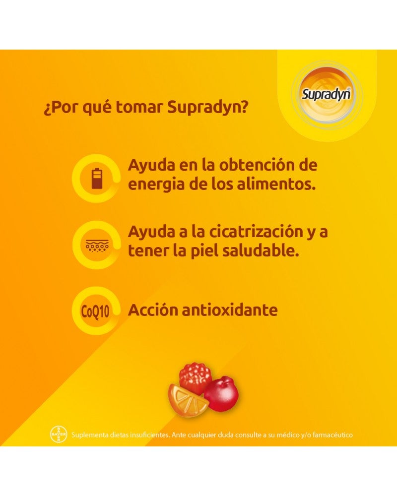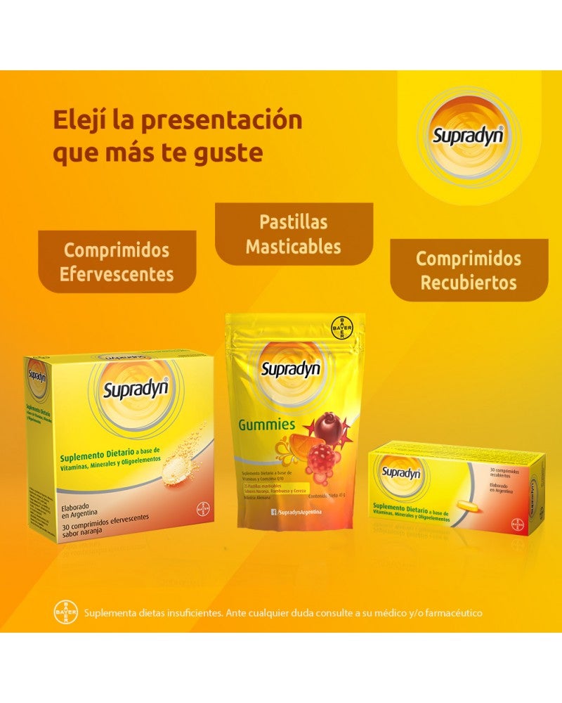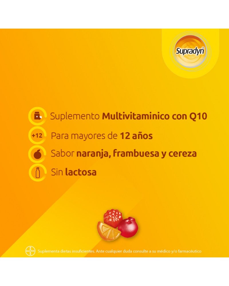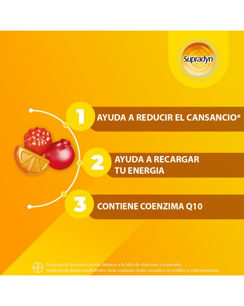 "Supradyn Gummies de Bayer es un Suplemento Dietario que contiene Vitaminas y Coenzima Q10 que ayudan a que disfrutes con energía el ritmo de tu día de una manera rica y practica. - Innovador Multivitamínico en formato pastillas masticables sabor naranja, frambuesa y cereza. - La función principal de la Coenzima Q10 es la de ser antioxidante. - Ayuda a reducir el cansancio y la fatiga. - Ayuda a la cicatrización y a tener la piel saludable. - Suplementa una alimentacion saludable. - Recargar tu energía nunca fue tan práctico. Supradyn está recomendado para adultos y niños mayores a 12 años. Supradyn es el Multivitamínico N°1 en ventas en Argentina. "